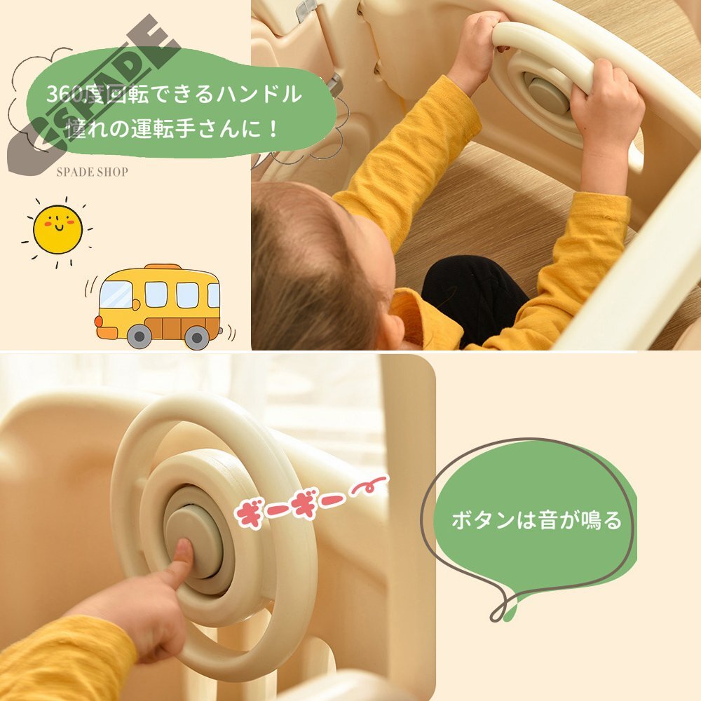 • 【バスのコックピット】広いスペースで絵本を読んだり、おもちゃの仲間と遊んだりして、独立性を育てる。 左右のドアが自由に開閉できる。 両方から乗る可能!360度回転できるハンドル、 憧れの運転手さんに! ボタンは音が鳴る。