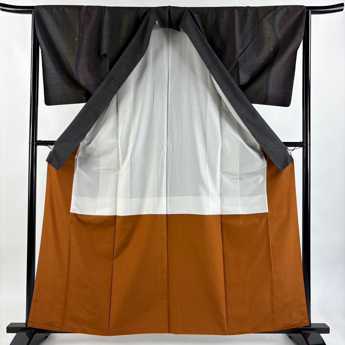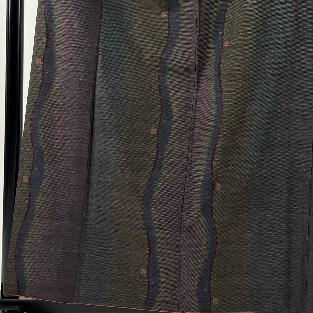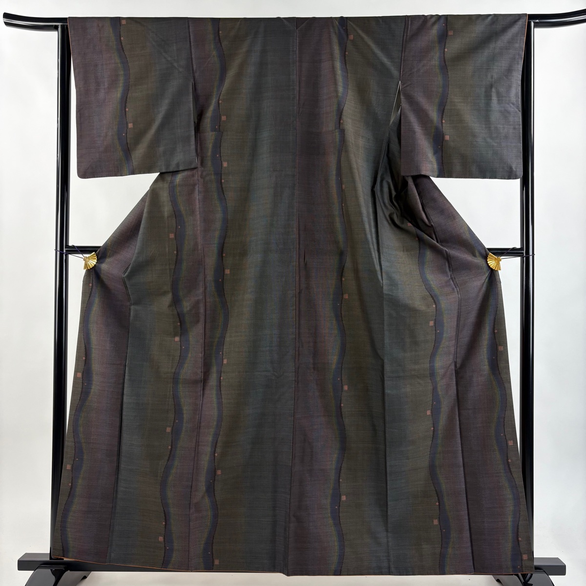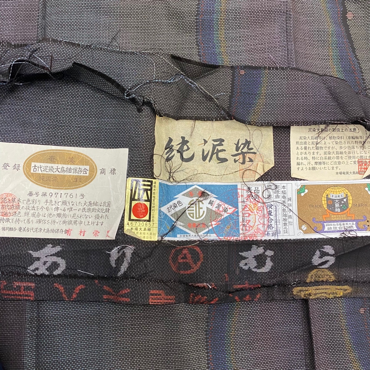 | 大島紬 美品 秀品 証紙 純泥染 幾何学 よろけ縞 茶紫 袷 身丈161.5 裄丈64.5 M 正絹 【中古】 |