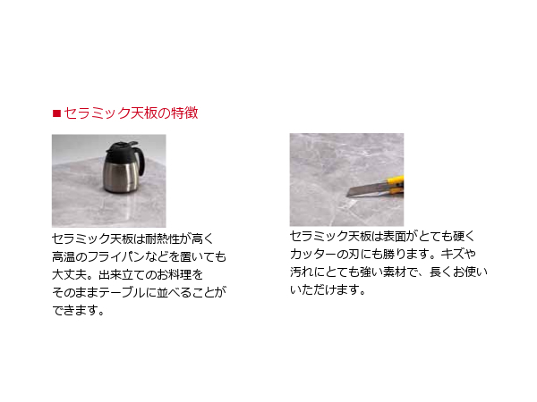機能性を備えたシンプルモダンなダイニングテーブル。天板には石目調のセラミック素材を採用、高級感のある空間を演出します。普段のお手入れは水拭きはもちろん、アルコール消毒もOK。清潔にお使いいただけます。