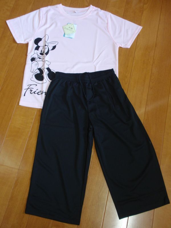 ★ミニーマウスがかわいい半袖Tシャツと七分丈のパンツのセットです♪Tシャツはピンク色、パンツは黒色です。