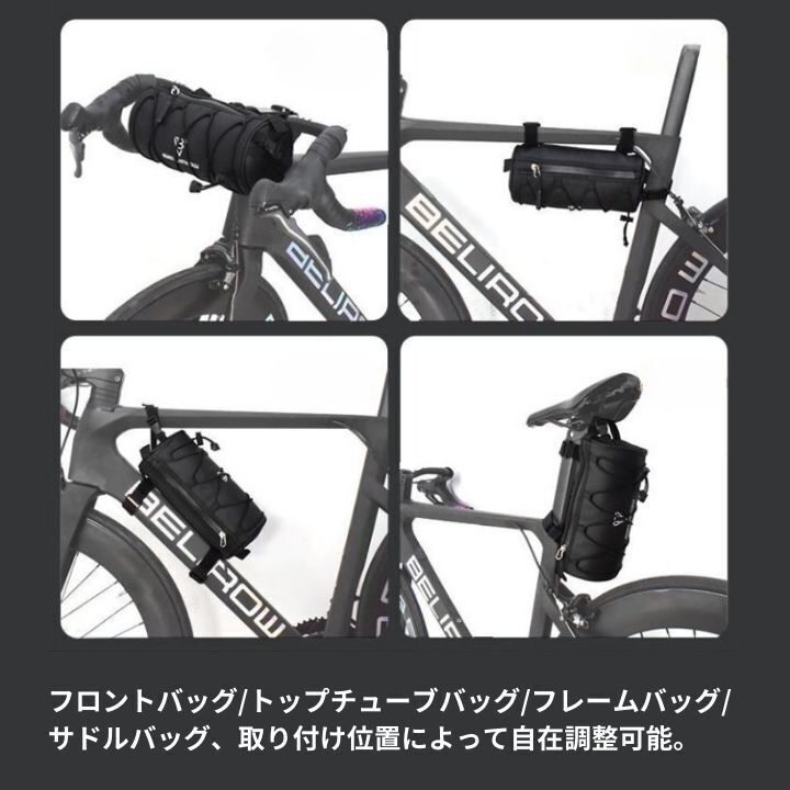 【4WAY取り付け可能】フロントバッグ/トップチューブバッグ/フレームバッグ/サドルバッグ、取り付け位置によって自在調整可能。