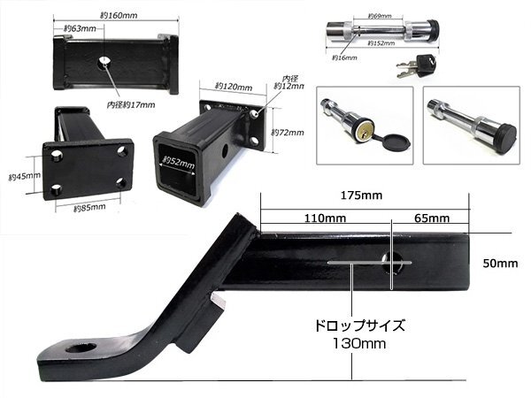 汎用 4穴 ヒッチメンバー 50mm角 50角 4インチ ブラック 黒 フルセット レシーバー&ボールマウント&ヒッチボール&ヒッチピン ロック付