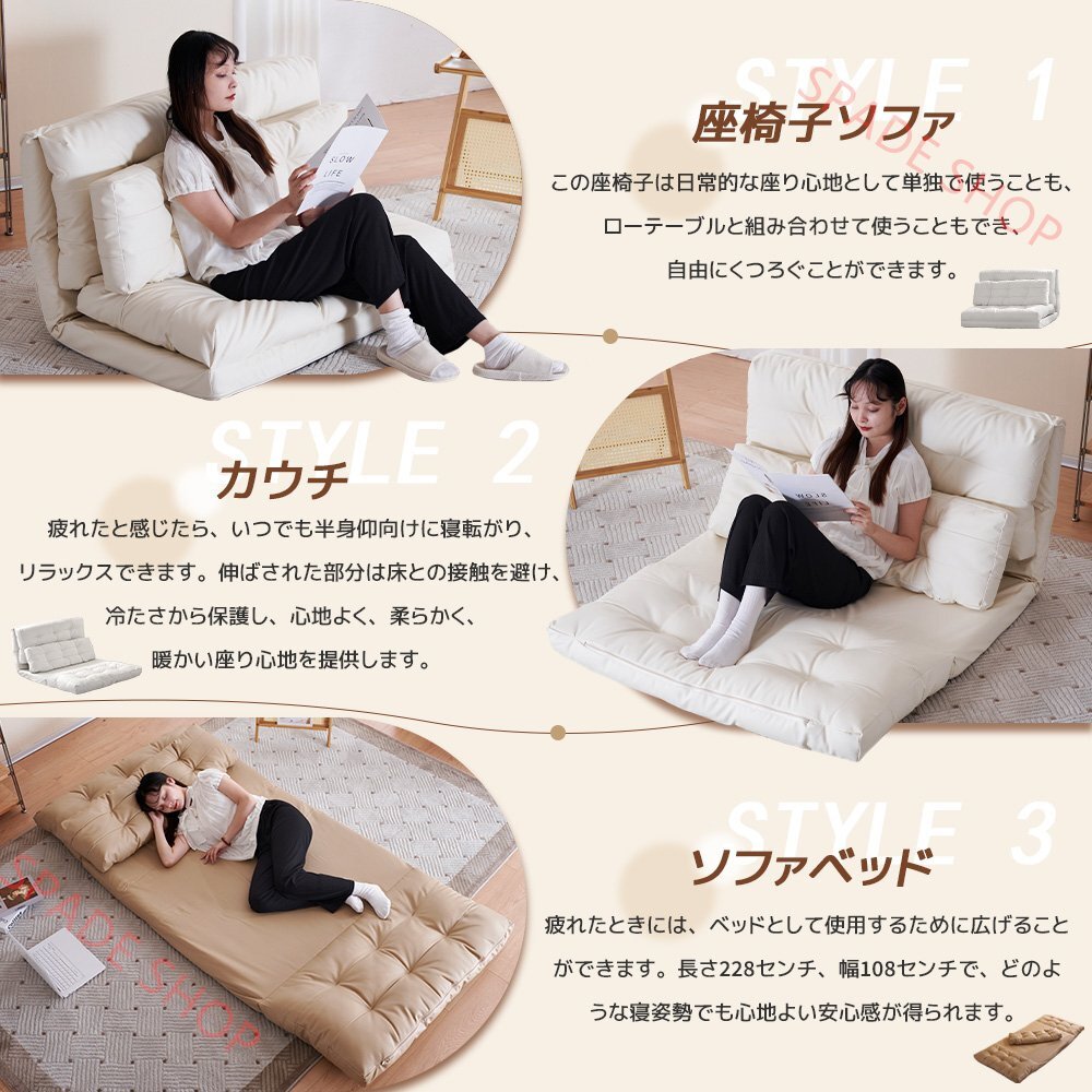 • ★【変幻自在に 自分好みの角度に】背面には6段階のリクライニング調節機能付き。細かな調節が可能なので、体勢に合わせてベストな角度で、ゆっくりと寛げます。さらにソファ時は座面を重ねてボリュームUP。上部のクッションは座った時のふかふか感や気持ちよさを追求。下部のクッションは少し硬めでより長く使用していただく為の 土台の役目を果たします。異なる硬さに設定したことで絶妙な座り心地、寝心地を実現しました。映画鑑賞などのゆったりしたい時はカウチスタイル、急な来客時などは簡易ベッドとして、様々なシーンに活躍します。ソファスタイルでもダブルクッションでゆったりと寛げいただけます。