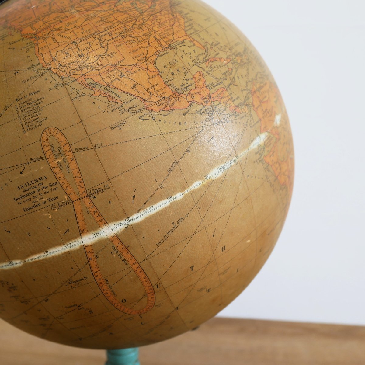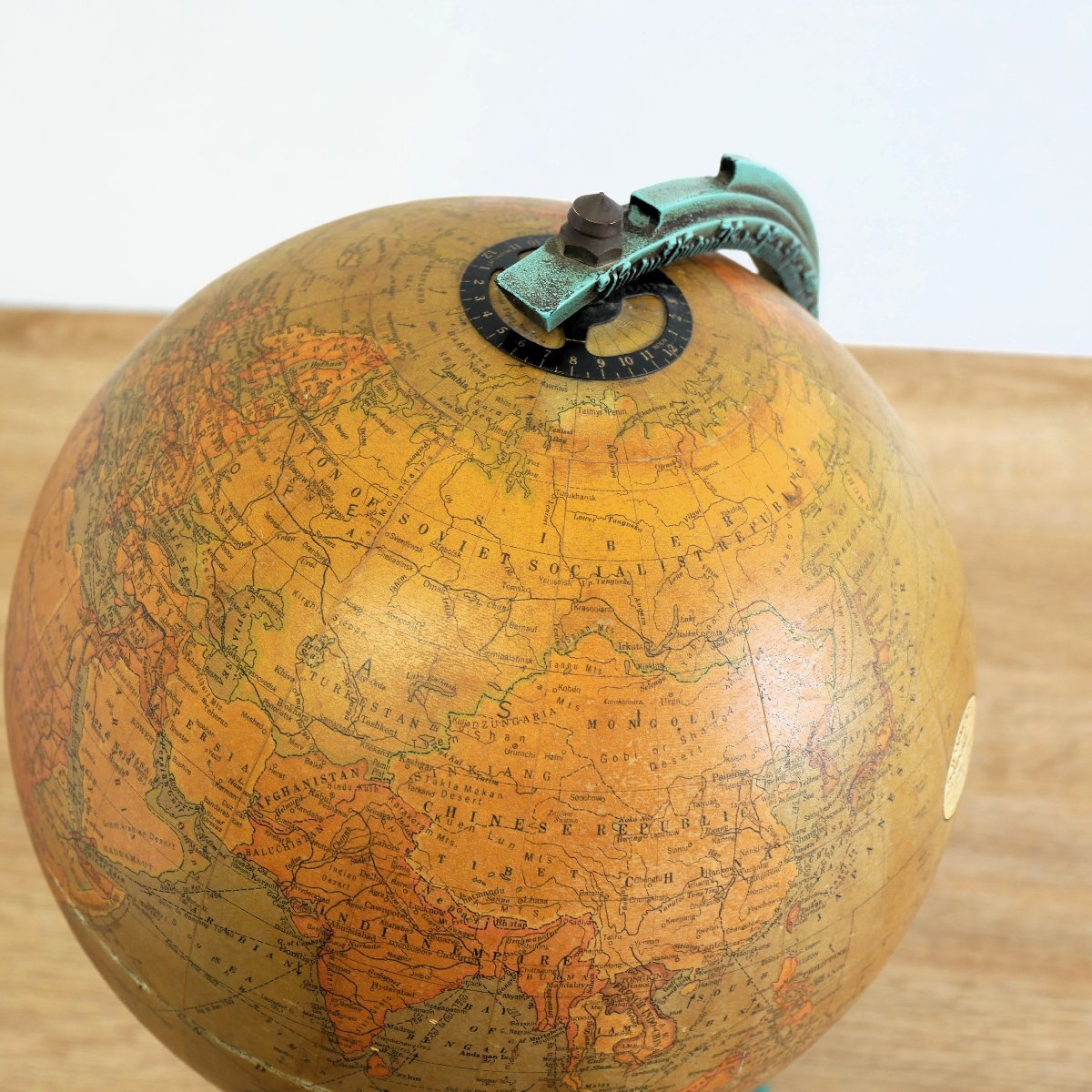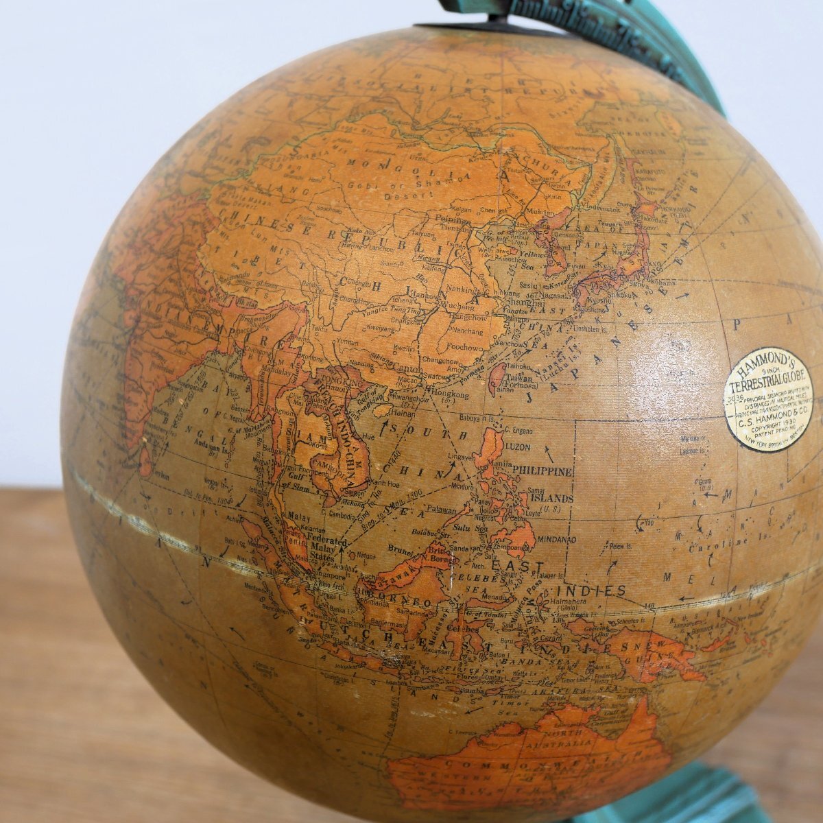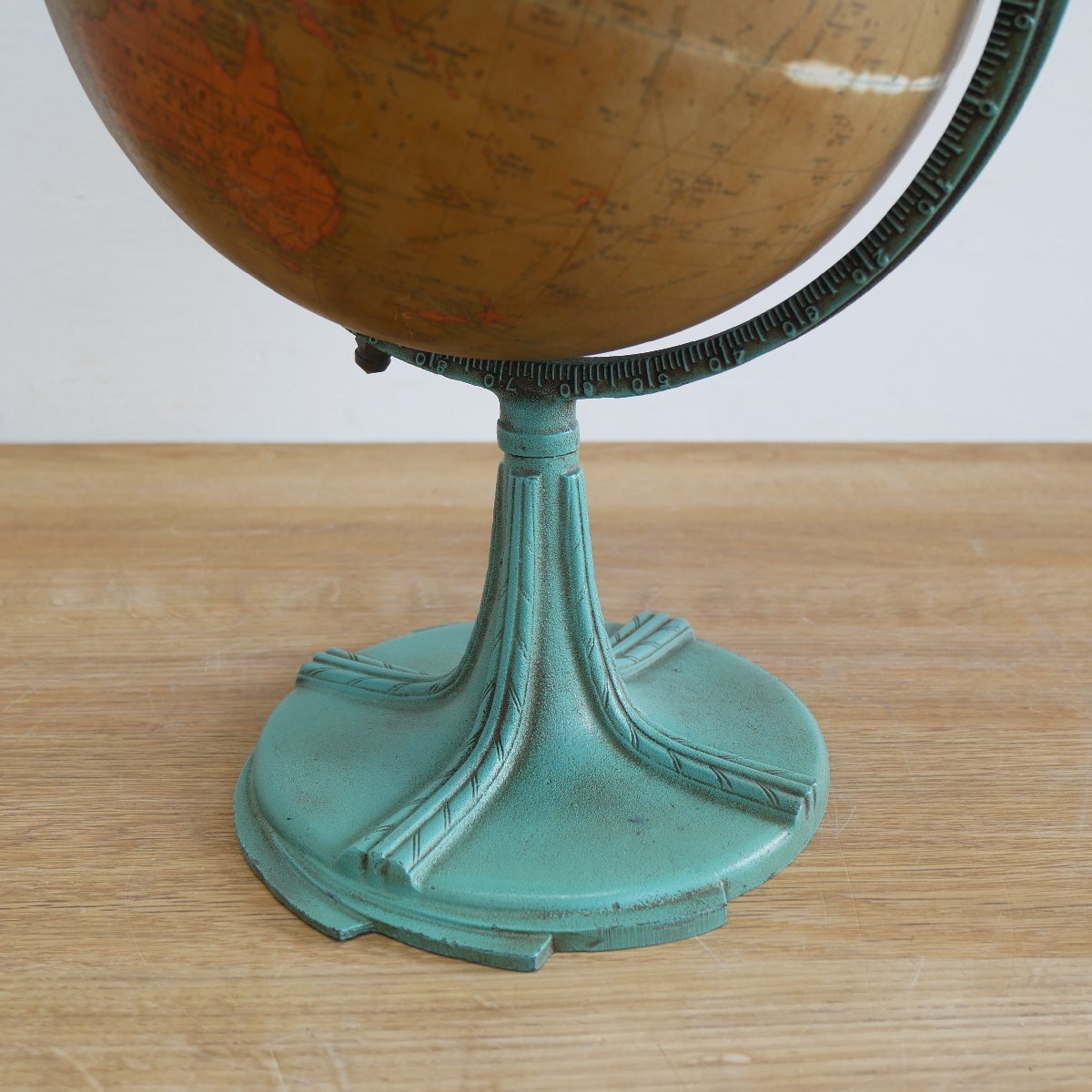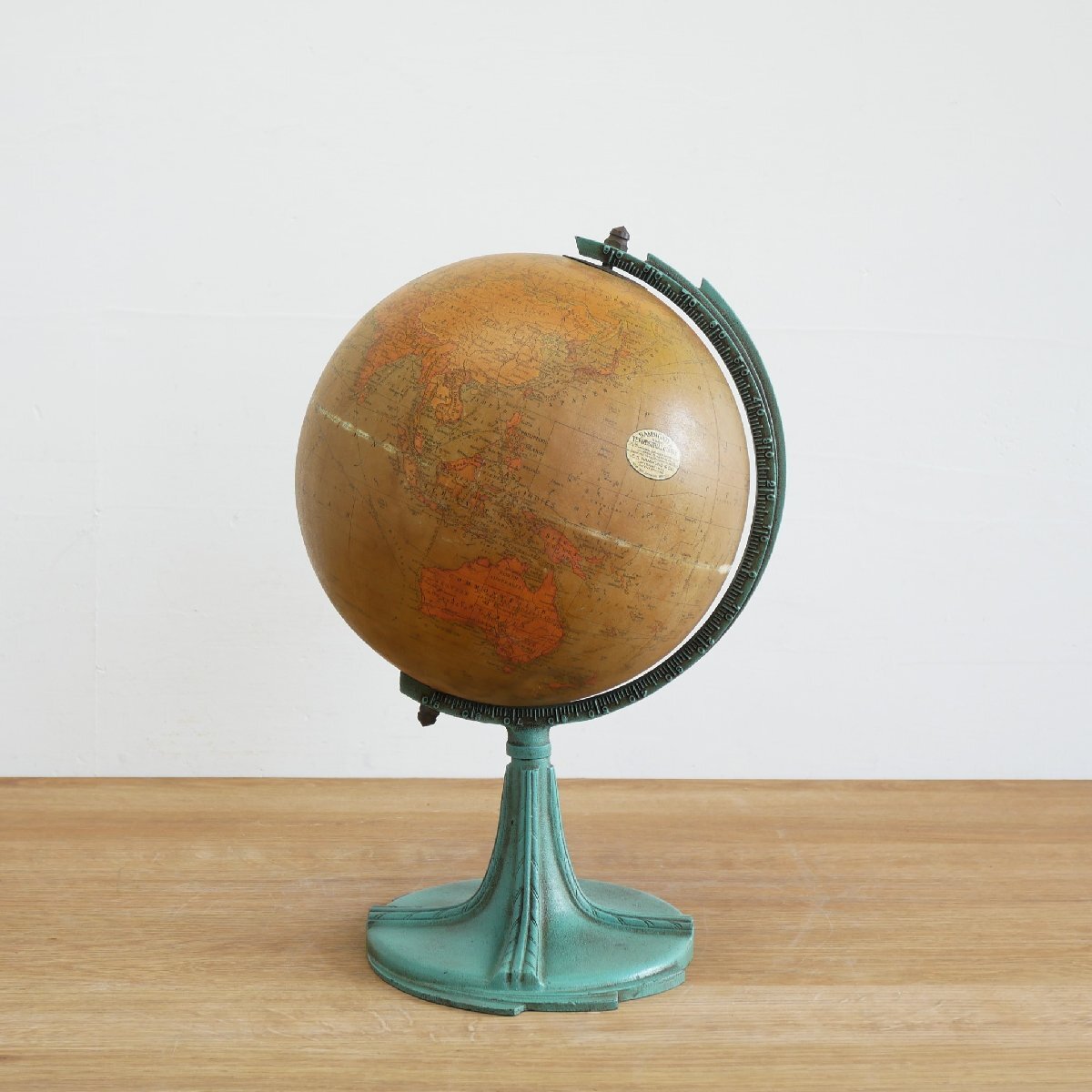 | 商品説明 explanation | 1800年代後半から地球儀と地図を製造している「CSハモンド社」の地球儀です。 韓国が「KOREA」表記のため南北分裂前の1948年以前のモノになります。 ※推定1930年から1940年代前半 球体はメタル製で、その上に印刷された紙(地図)が貼られています。 アールデコデザインの美しい地球儀を、ディスプレイ小物にいかがでしょうか。 球体:メタル、紙 台座など:メタル |