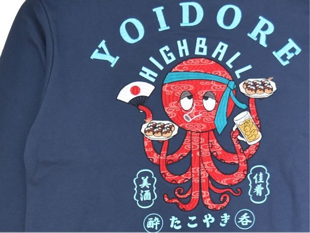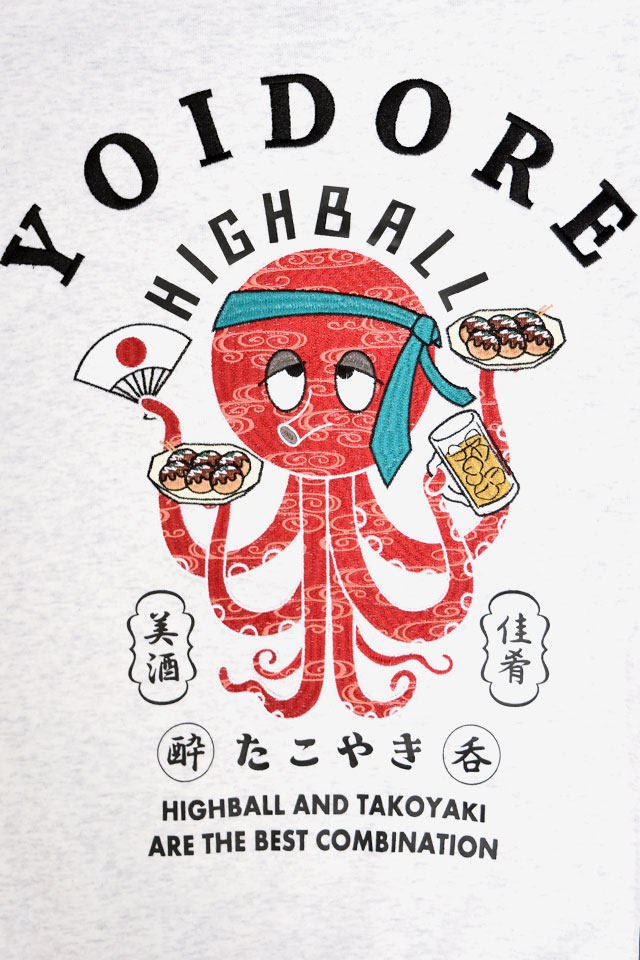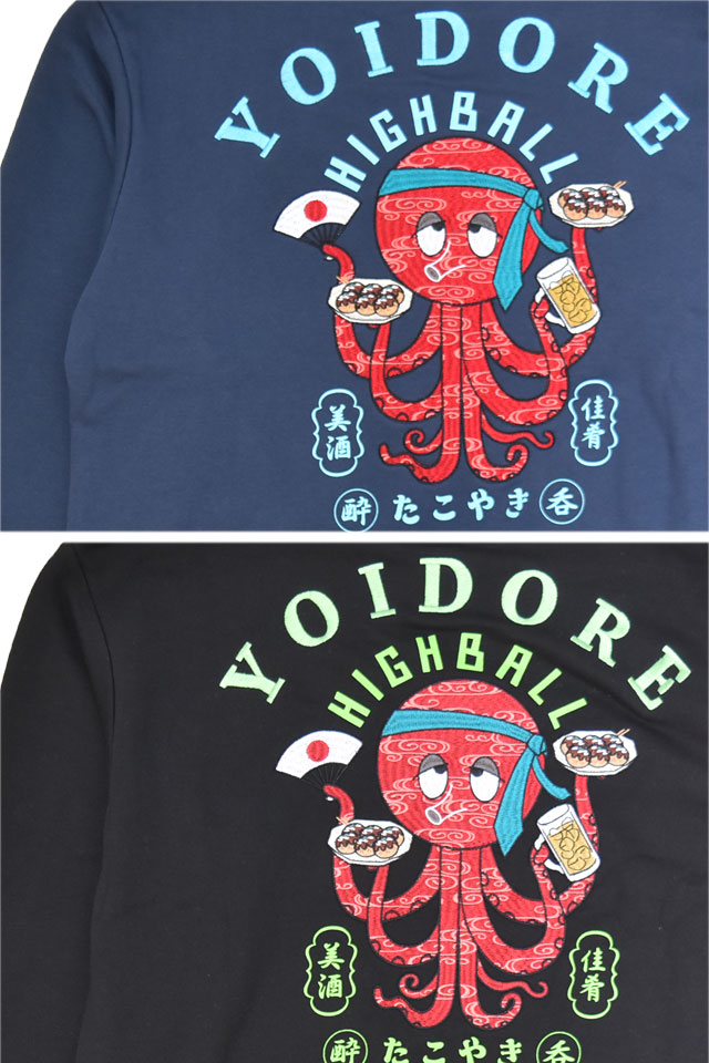 すべての酔いどれに届ける、酔いどれのためのブランド「YOIDORE」より「ハイボールとたこ焼きクルーネックスウェット(845601)」が入荷してまいりました。 酔いどれ(酔っ払い)に届ける、酔いどれ(酔っ払い)のためのブランド。 お酒をテーマにした様々なデザインを落とし込んで展開。 気鋭のアーティストや酒造メーカー、人気ショップとのコラボレーションや、型にはまらない独特の世界感を表現した新感覚のアパレルブランドです。 老若男女お酒好きな方、お酒のお供にいかがでしょうか。 さりげなくJAPANカルチャーをフューチャーした至高のアイテムです。 頭にネクタイを巻いた、これぞ酔いどれのたこを背中にデザイン。 たくさんの手にハイボールやたこ焼き、扇子を掲げ、ご機嫌な様子が描かれています。 フロントには「ハイボール濃いめ」の文言。 それぞれのボディーカラーに合わせて、用いる色味に変化を持たせているところもポイントです。 袖口にはブランドロゴ入りの刺繍ワッペンを縫い付けました。 ボディは綿をベースにポリエステルを絶妙に混紡し、綿の風合いを消さずに柔らかく、重過ぎずにサラリとした着心地をキープする裏毛生地を使用したYOIDOREオリジナルです。 ややゆったりめのルーズなシルエットは適度なリラックス感があり、ラフな呑みシーンでのコーディネートに取り入れたいマストなアイテム。 全ての商品にシーズン毎にデザインが変わる限定ステッカー付きです。 | ||||||||||||||||||||