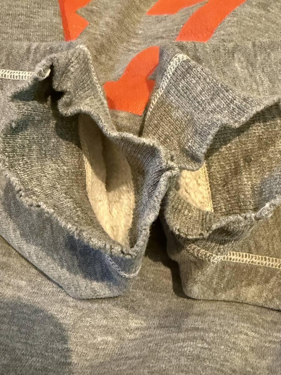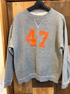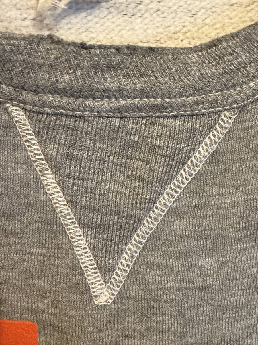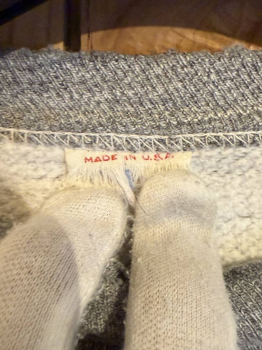 60〜70年代頃のヴィンテージ前Vスェットです。タグが半分欠損してますのでブランドと素材はわかりませんが、USA製です。ラッセル社のタグにこの系統が多い気がします。フロントにはラバープリントで47とあります。首リブ、袖リブに多数のダメージがあり、小穴が2ヶ所とリペア痕があります。裾のリブの縫い目にもダメージがあります。生地の状態はしっかりしてますのでまだまだ着用は可能ですし、年代的に状態は良い方だと判断します。肩幅約51cm(袖付け根から袖付け根まで)、袖丈約49cm(脇下から袖口まで)、身幅約57cm(脇下から脇下まで)、総丈約59cm(首後ろから裾まで)です。画像が全てですで画像にて判断をお願い致します。ノンクレーム、ノンリターンでお願い致します。落札額に納得出来ない時はお知らせも無く取り消しさせて頂く場合もございます。予めご了承下さいませ。