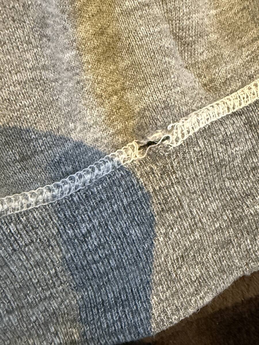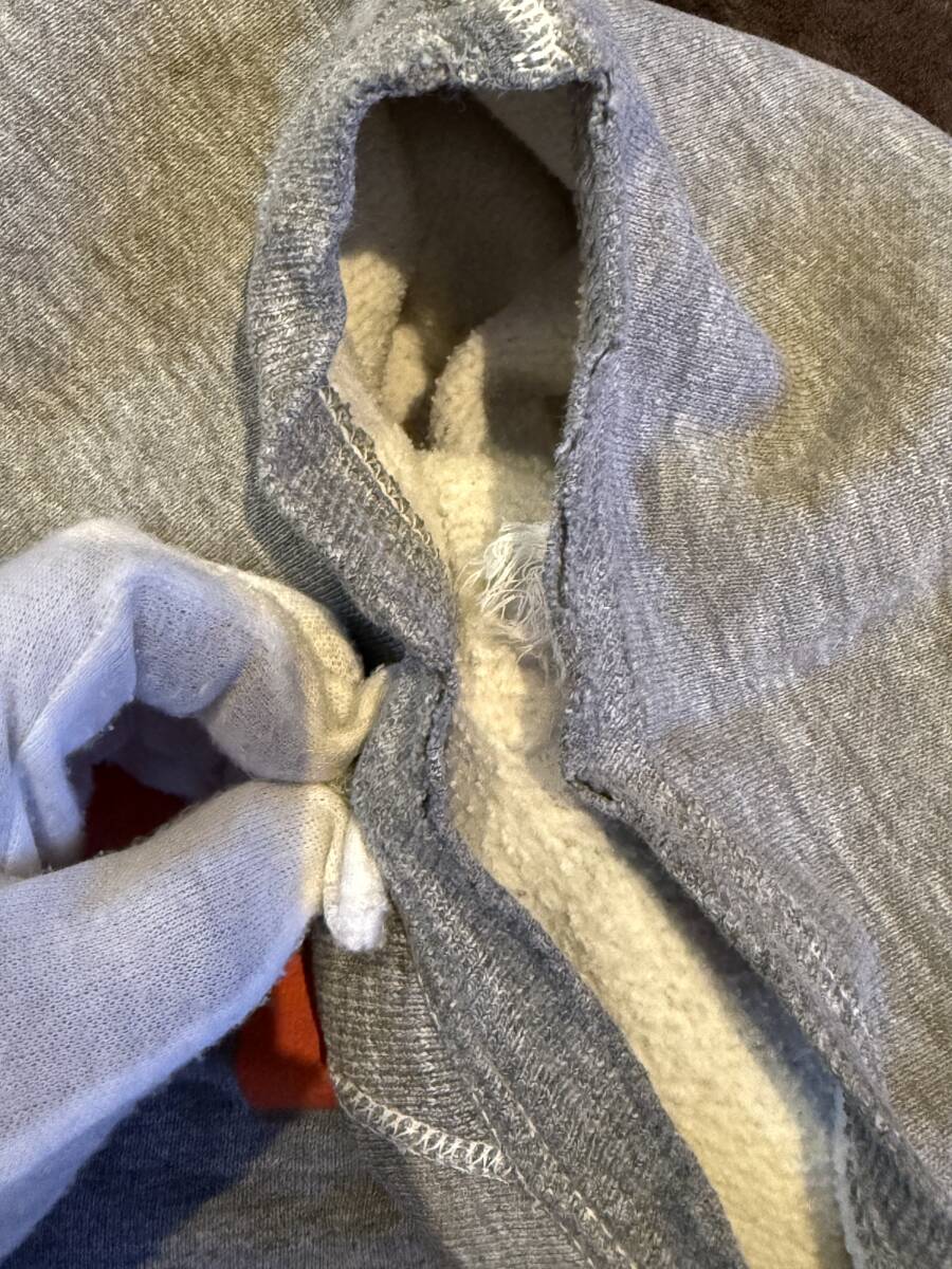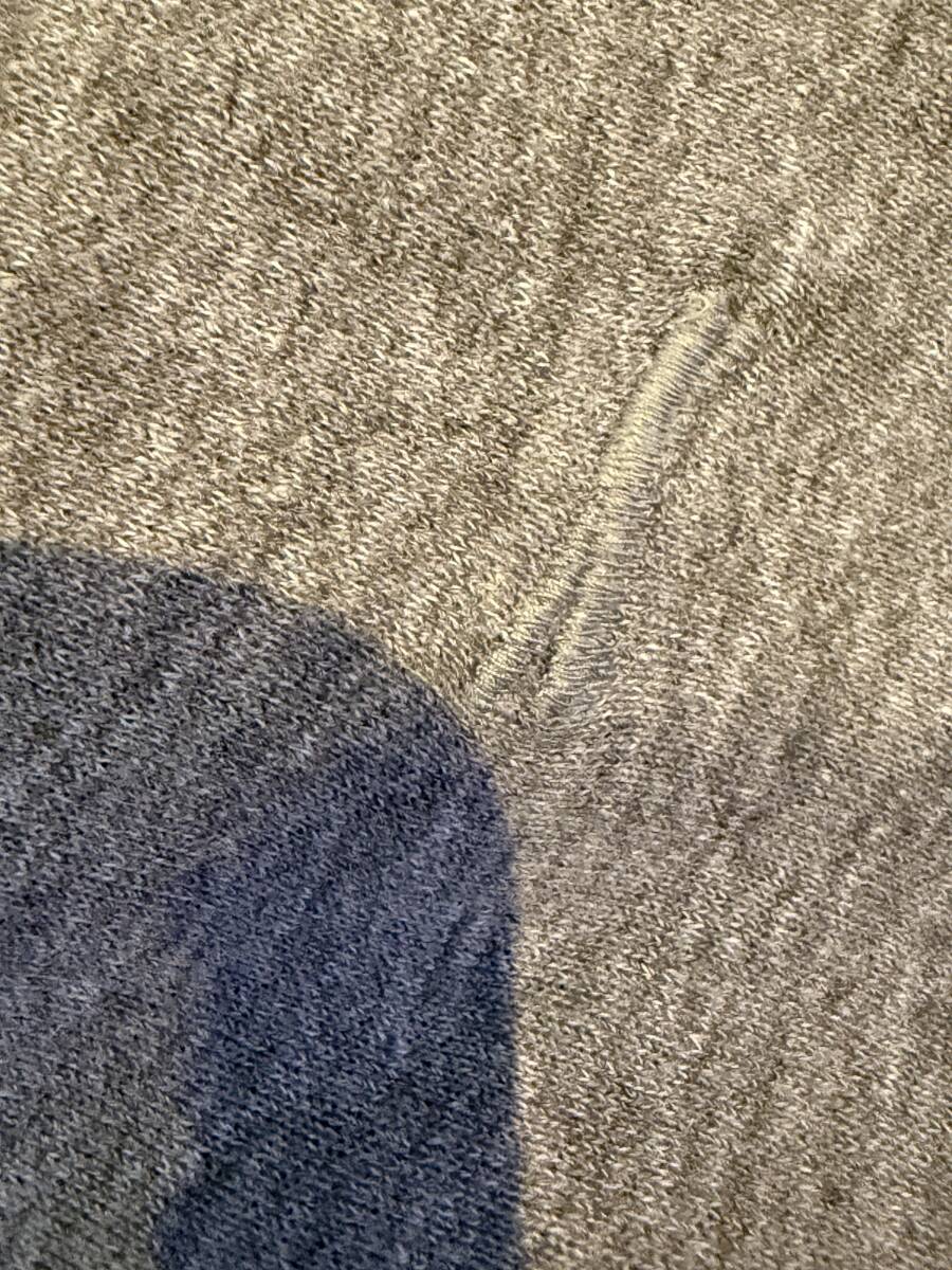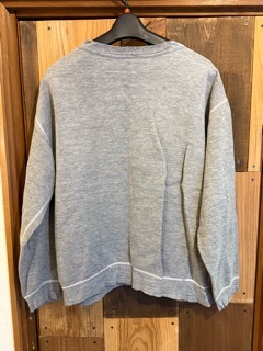 60〜70年代頃のヴィンテージ前Vスェットです。タグが半分欠損してますのでブランドと素材はわかりませんが、USA製です。ラッセル社のタグにこの系統が多い気がします。フロントにはラバープリントで47とあります。首リブ、袖リブに多数のダメージがあり、小穴が2ヶ所とリペア痕があります。裾のリブの縫い目にもダメージがあります。生地の状態はしっかりしてますのでまだまだ着用は可能ですし、年代的に状態は良い方だと判断します。肩幅約51cm(袖付け根から袖付け根まで)、袖丈約49cm(脇下から袖口まで)、身幅約57cm(脇下から脇下まで)、総丈約59cm(首後ろから裾まで)です。画像が全てですで画像にて判断をお願い致します。ノンクレーム、ノンリターンでお願い致します。落札額に納得出来ない時はお知らせも無く取り消しさせて頂く場合もございます。予めご了承下さいませ。