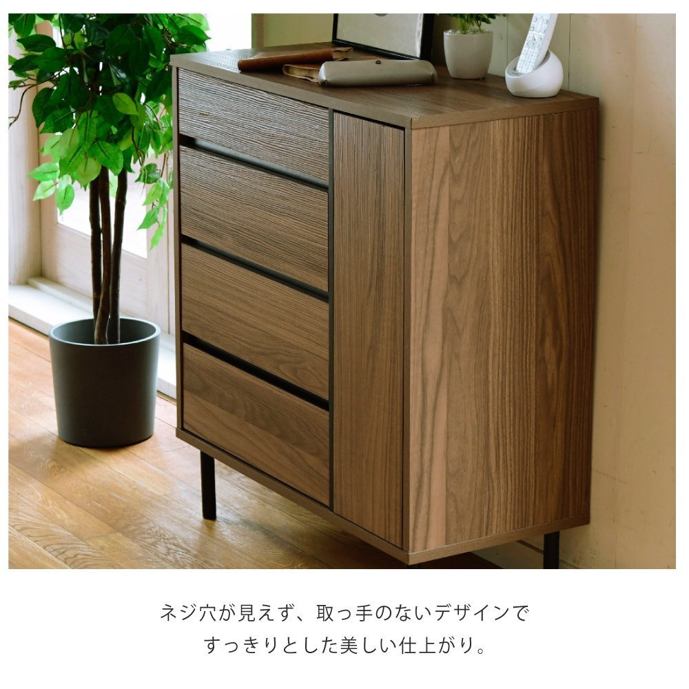 | 落ち着いた木目調のブラウンとブラックスチールの組み合わせがモダンな印象を与える、 北欧テイストシリーズ“Fresser”。 4段のチェストに扉収納がついたワイドチェストは、シンプルだからこそ使いやすいアイテムです。 |