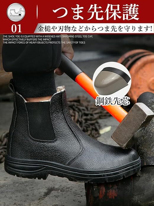 【つま先保護】鋼鉄製先芯が金槌落下などの衝撃からつま先を保護します。作業現場での思わぬ事故から足を守る、プロ仕様の安全設計を実現しています。