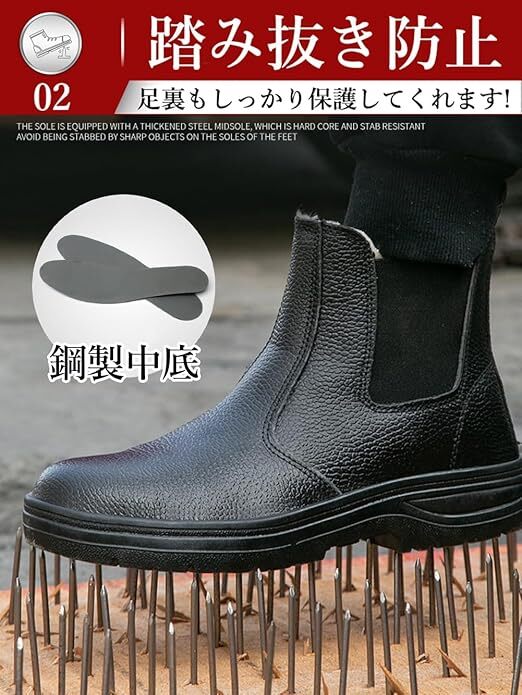 【踏み抜き防止】釘が散乱する現場でも、強化された鋼製中底が足裏を貫通から守ります。危険物が存在する環境で必須の安全機能です。