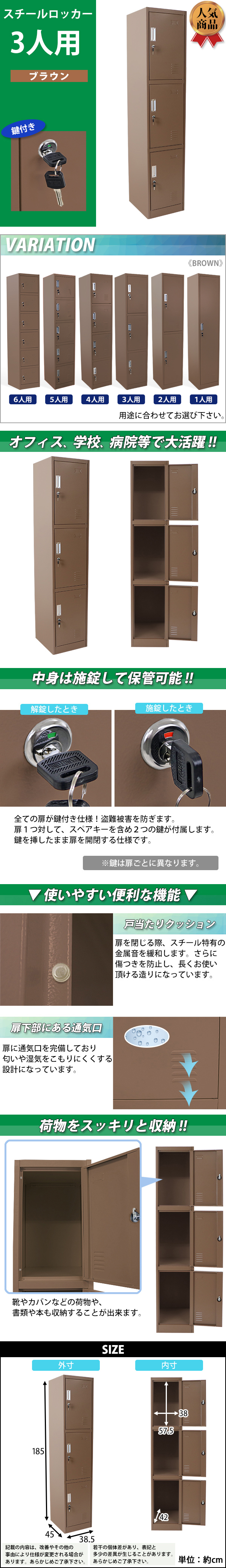 | 商品名 | 送料無料 ロッカー おしゃれ スチールロッカー 3人用 ブラウン 鍵付き スペアキー付き 1列3段 スチール製 収納 オフィス 事務所 会社 店舗 病院 学校 業務用 スリム かぎ付き 更衣ロッカー 更衣室 オフィスロッカー スチールキャビネット オフィス家具 茶 sy10007newbr |