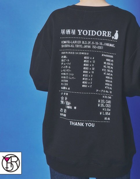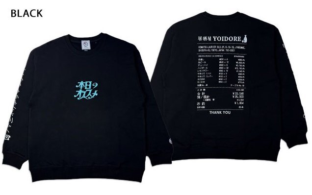 すべての酔いどれに届ける、酔いどれのためのブランド「YOIDORE」より「本日のオススメ クルーネックスウェット(845602)」が入荷してまいりました。 酔いどれ(酔っ払い)に届ける、酔いどれ(酔っ払い)のためのブランド。 お酒をテーマにした様々なデザインを落とし込んで展開。 気鋭のアーティストや酒造メーカー、人気ショップとのコラボレーションや、型にはまらない独特の世界感を表現した新感覚のアパレルブランドです。 老若男女お酒好きな方、お酒のお供にいかがでしょうか。 さりげなくJAPANカルチャーをフューチャーした至高のアイテムです。 大人気「日本語ロゴ」シリーズの新作はワードは「本日のオススメ」! レトロな雰囲気のフォントを立体感のあるPVCプリントで配置して、フロントの存在感を主張します。 袖に刺繍で入ったロゴは「ノミニイクナラデンワシテ」 呑みに行きたいお相手に、袖をチラチラ見せて控えめにアピールしましょう! バックデザインのレシートにもご注目!まさかのハイボール×32!!! ここだけの話、YOIDOREデザイナーのある夜の記録だそうです。 ボディは綿をベースにポリエステルを絶妙に混紡し、綿の風合いを消さずに柔らかく、重過ぎずにサラリとした着心地をキープする裏毛生地を使用したYOIDOREオリジナルです。 ややゆったりめのルーズなシルエットは適度なリラックス感があり、ラフな呑みシーンでのコーディネートに取り入れたいマストなアイテム。 全ての商品にシーズン毎にデザインが変わる限定ステッカー付きです。 | ||||||||||||||||||||