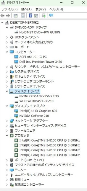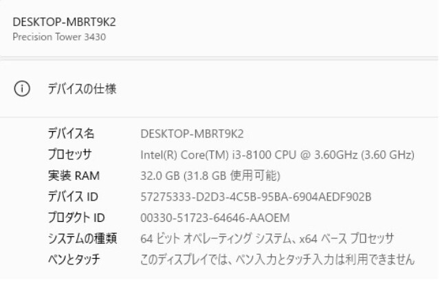 Precision Tower 3430 / Core i3-8100 @3.60GHz / メモリ32GB / M.2 SSD 256GB(NVMe)+HDD1TB / DVDマルチ / Windows11 Pro 64bit
