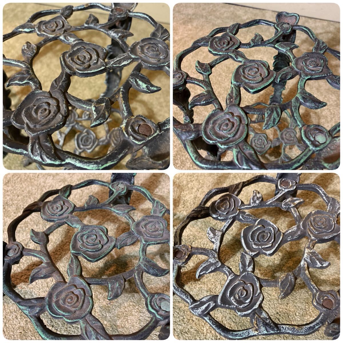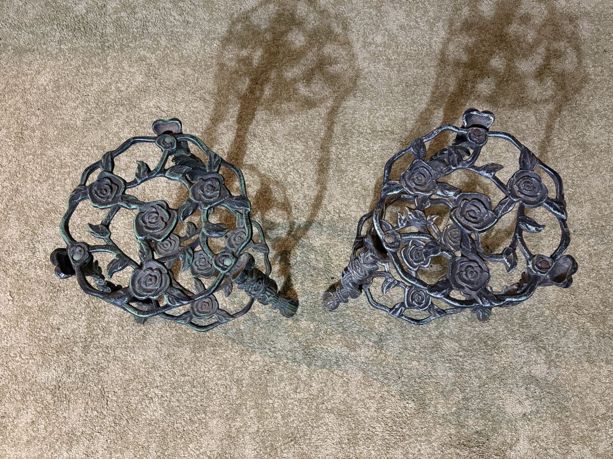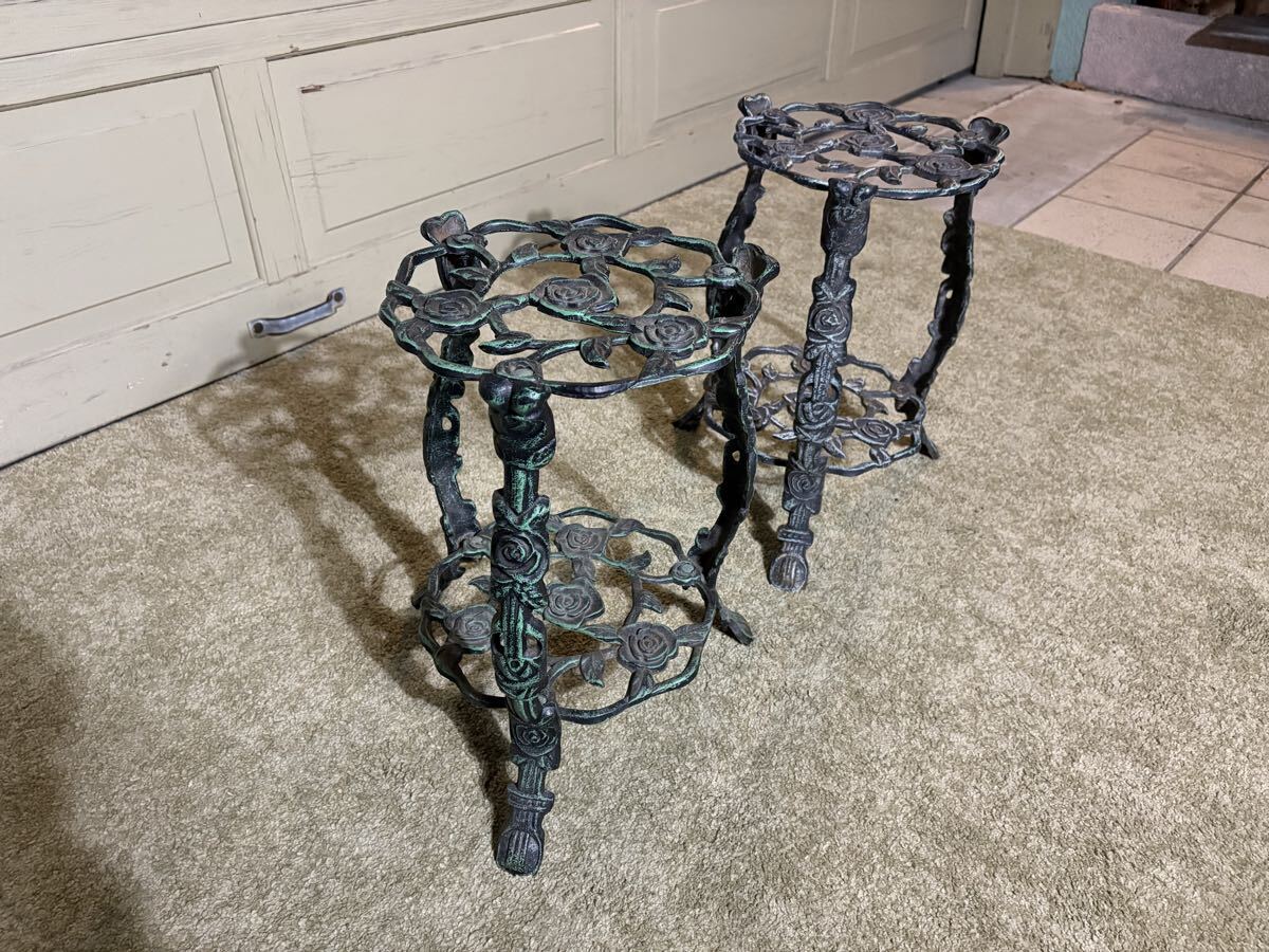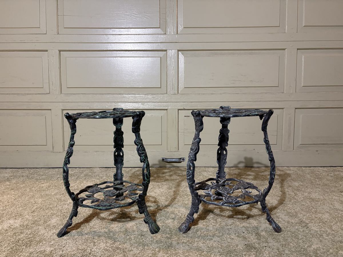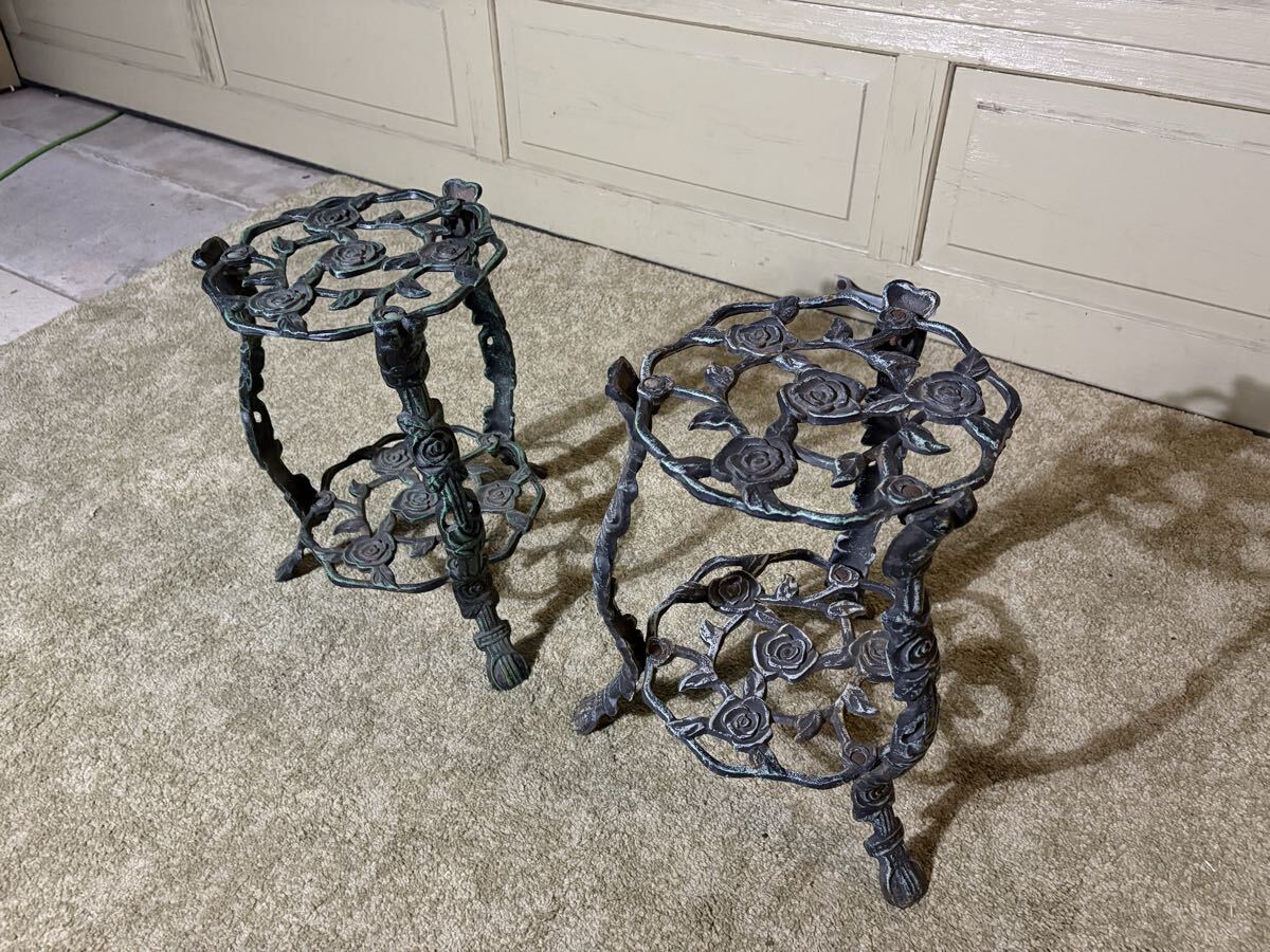 バラ模様の透かし細工が華やかで、2段仕様のため鉢植えや小物を飾るのに最適です。2台並べていただくと存在感があり、インテリアのアクセントになります。