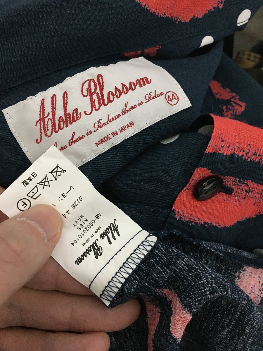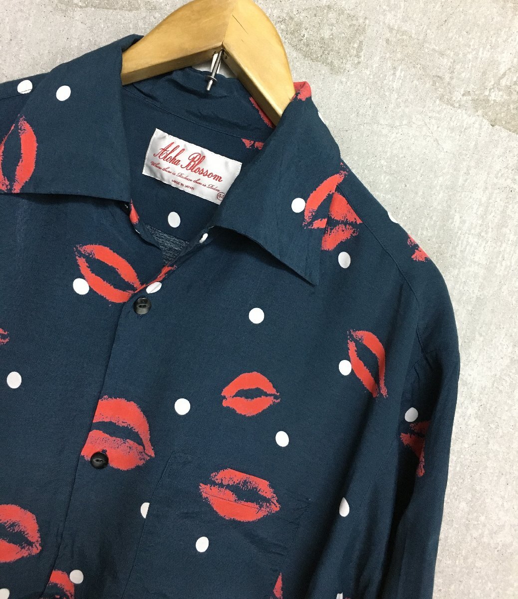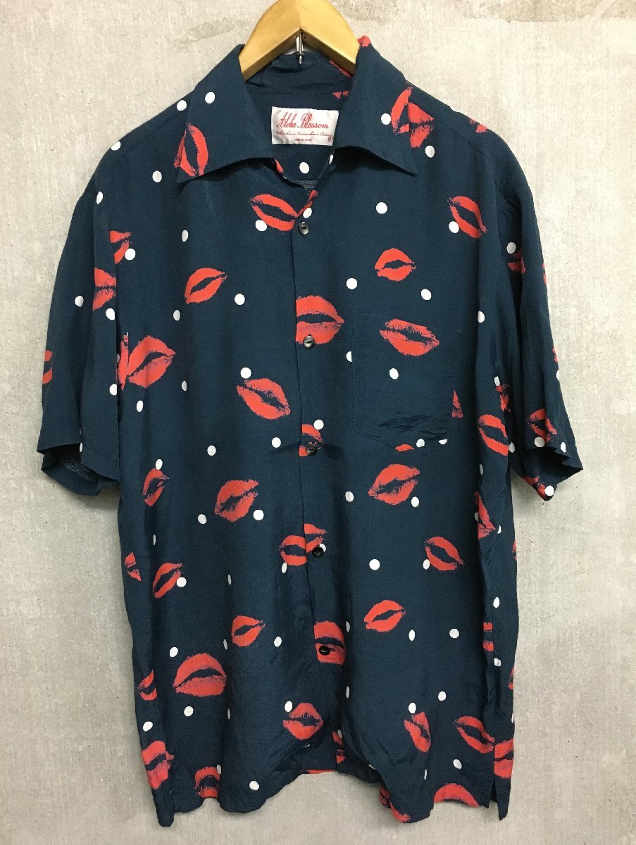 ◆Aloha Blossom アロハブロッサム キスマーク リップ&水玉 ポケット付き アロハシャツ ネイビー サイズ44
