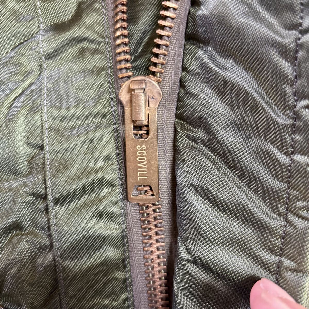 SCOVILL 製のデカブラスジッパー、風の侵入を抑える前立て構造、しっかりとした内側リブなど、軍用ジャケットならではの機能的な作り込みが随所に見られます。
