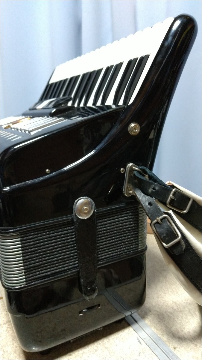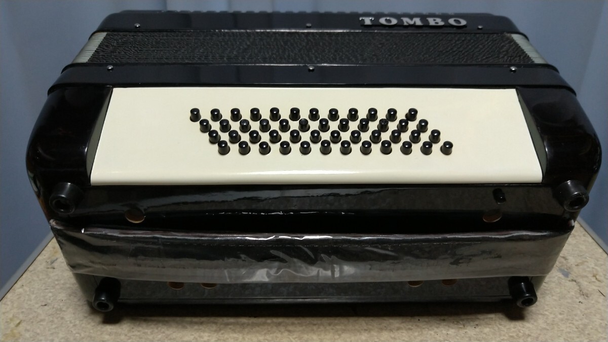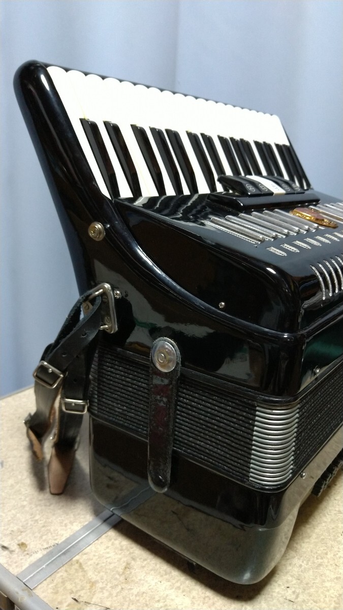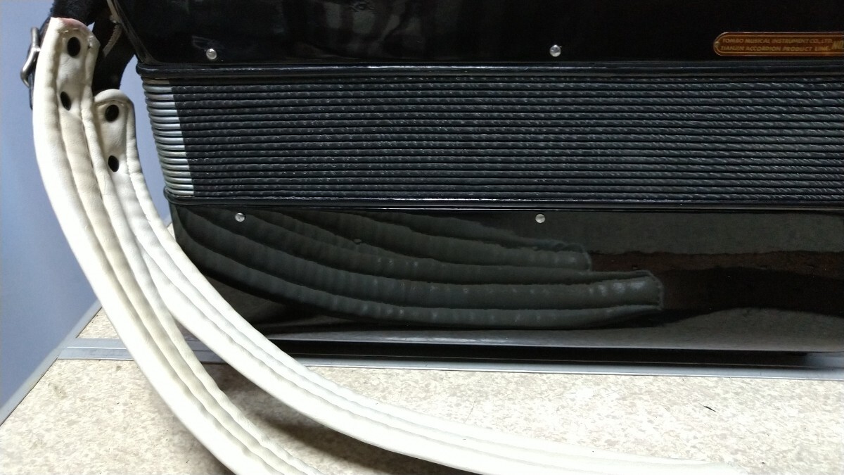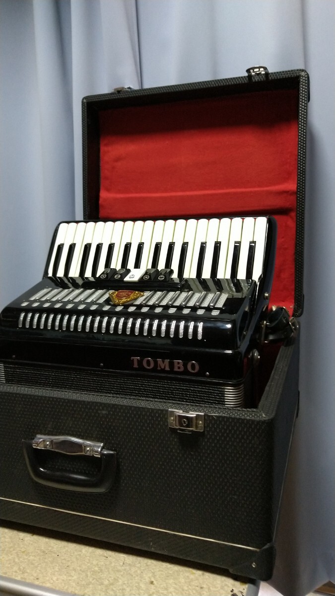 コレクション放出。現在もTOMBOで販売中152000円です。購入後あまり使用しないのにあきらめ、お蔵入りになった品物。中古の中での外観は超美品です。鍵盤の傷もなく綺麗です。ベースベルト問題無くビニールで保護されています(ベルトの調整範囲が少なく緩め過ぎるとネジが抜けます)。サイドストラップ問題無し、ショルダーベルトは使用感少なく傷み箇所無く綺麗です。ベルトの長さが左右同じなので初心者でしょう。蛇腹気密性まったく問題なしです。鍵盤、ベースボタン動き問題なし、音色切り替え問題なしです。ハードケースは傷みもなく目だつ汚れや破れもありません。