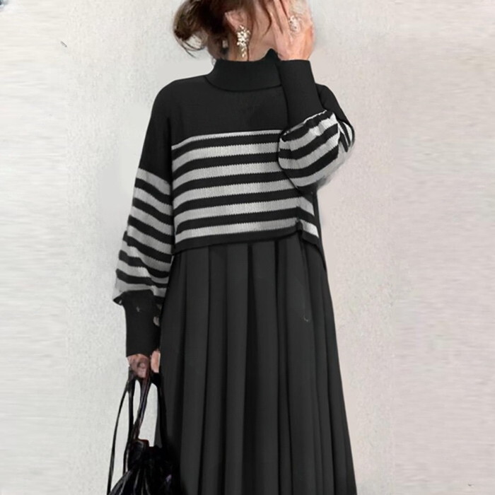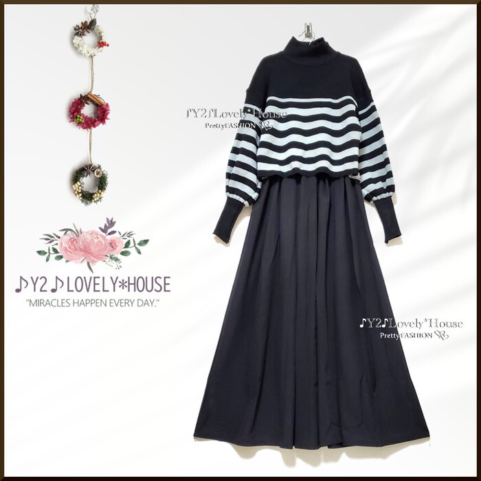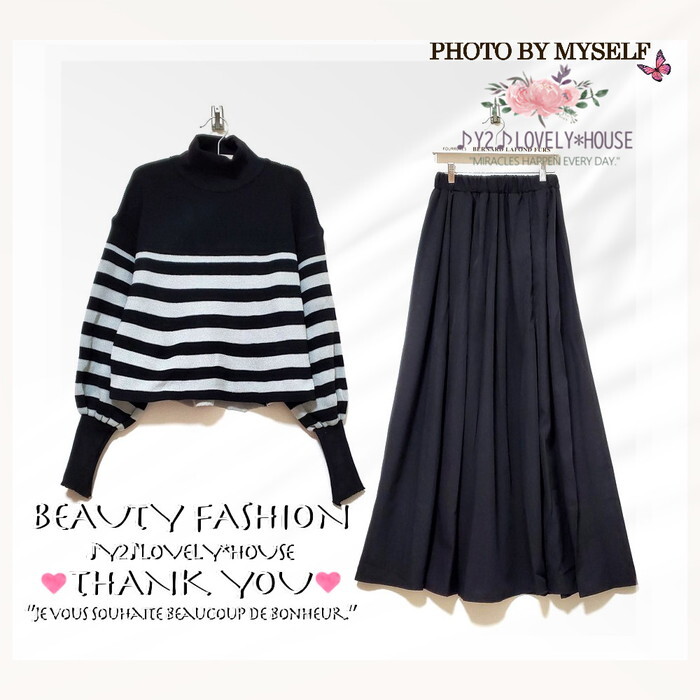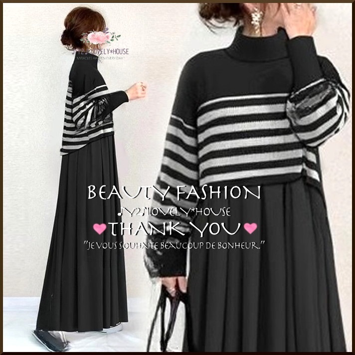 | 【~3L4L相当】2点セット/ボーダーハイネックニットトップス+マキシ丈スカート | |||