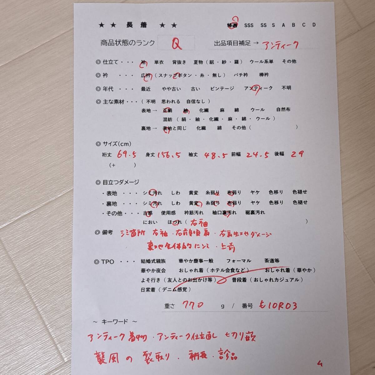 | Z | 着用向けではなくコレクション、鑑賞向けとして販売するお品ものです。布の力が無くリメイクも難しい場合が多いです。 様々な難やシミなどございますので、古き物をご理解いただける方のみご入札ください。ノンクレームノンリターンでお願いいたします。 |