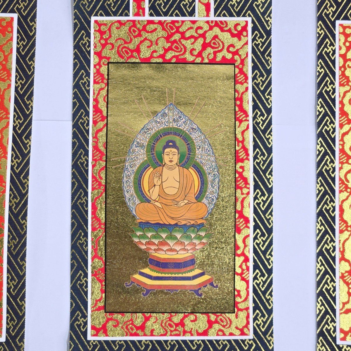 | ▼商品名 | 【未使用保管品 3点セット】 臨済宗妙心寺派 本尊 脇侍 掛軸 70代 紺表層 金地面 掛け軸 釈迦如来 無相大師 花園法皇 仏壇 複数在庫あり |