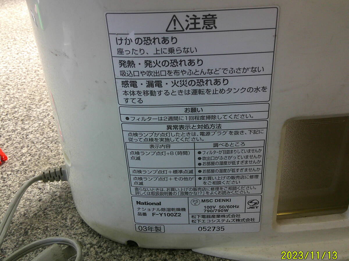 CH-11-10 Nationalナショナル 除湿乾燥機 F-Y100Z2 2003年製 平日のみ直引取可