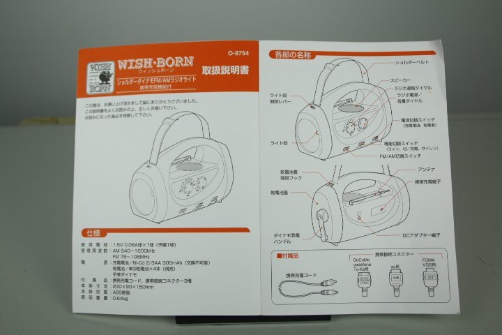 WISH・BORN ウィッシュボーン ショルダーダイナモ FM/AMラジオライト 携帯充電機能付き O-9754