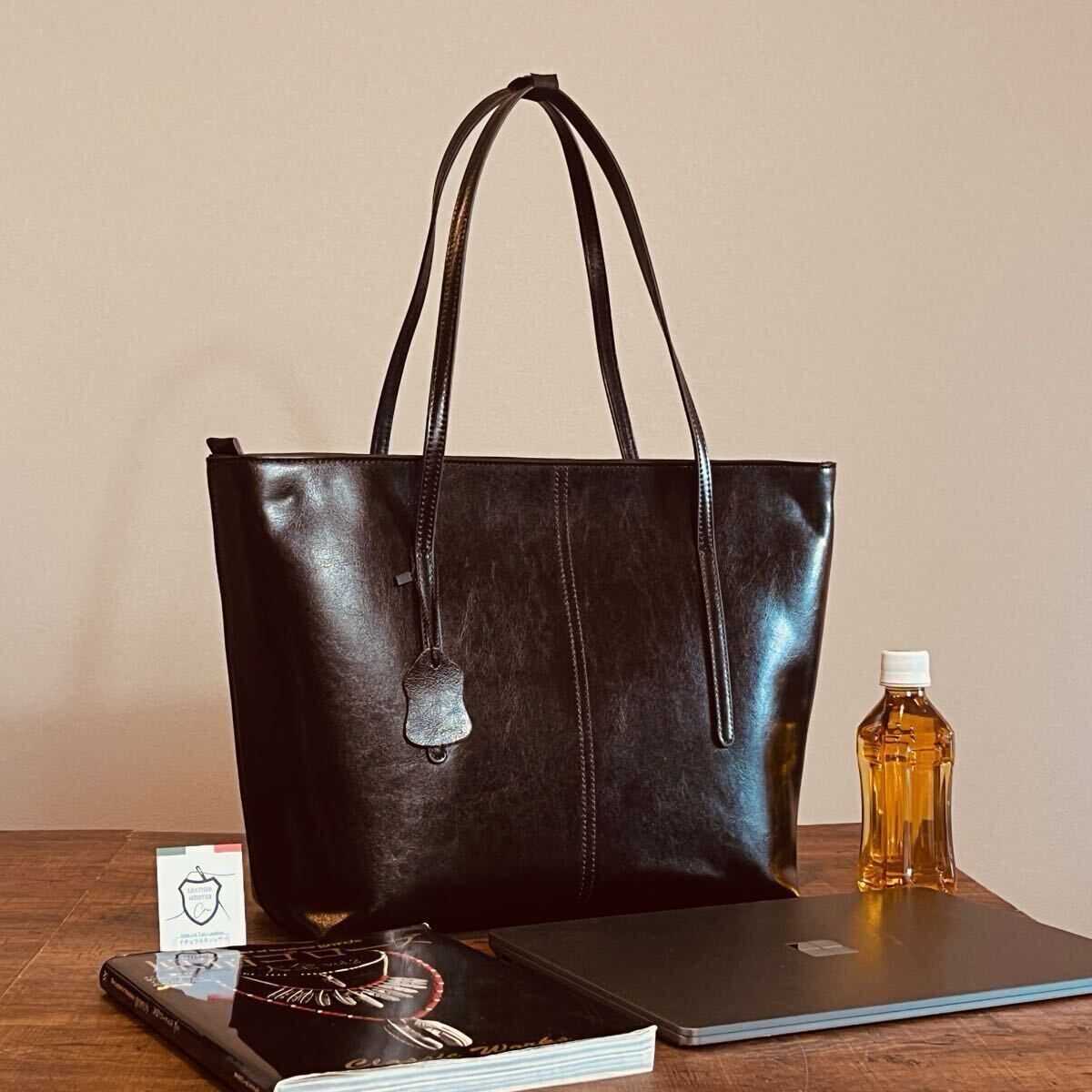 たっぷりの書類を詰め込みたいビジネスシーンや、休日のちょっとした旅行にも好相性な頼れる大容量の本革シンプルトートです。