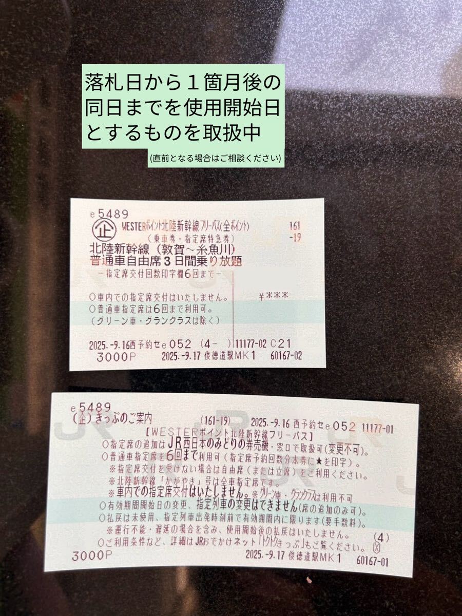 ・ご利用最終日が12月25日のものまで取り扱い可能です。ただし、使用開始日が落札日の1箇月後の同日となるものまでの取扱いです。(例:10月10日に落札した場合、11月10日までの任意の日付を使用開始日とするのきっぷを取り扱っています。)
