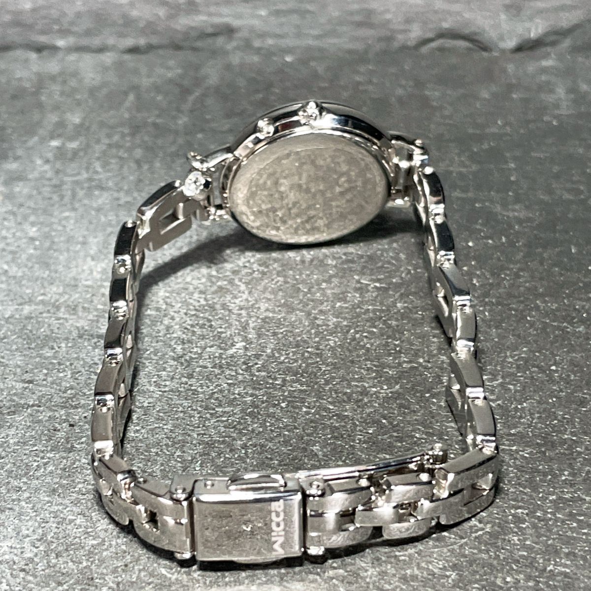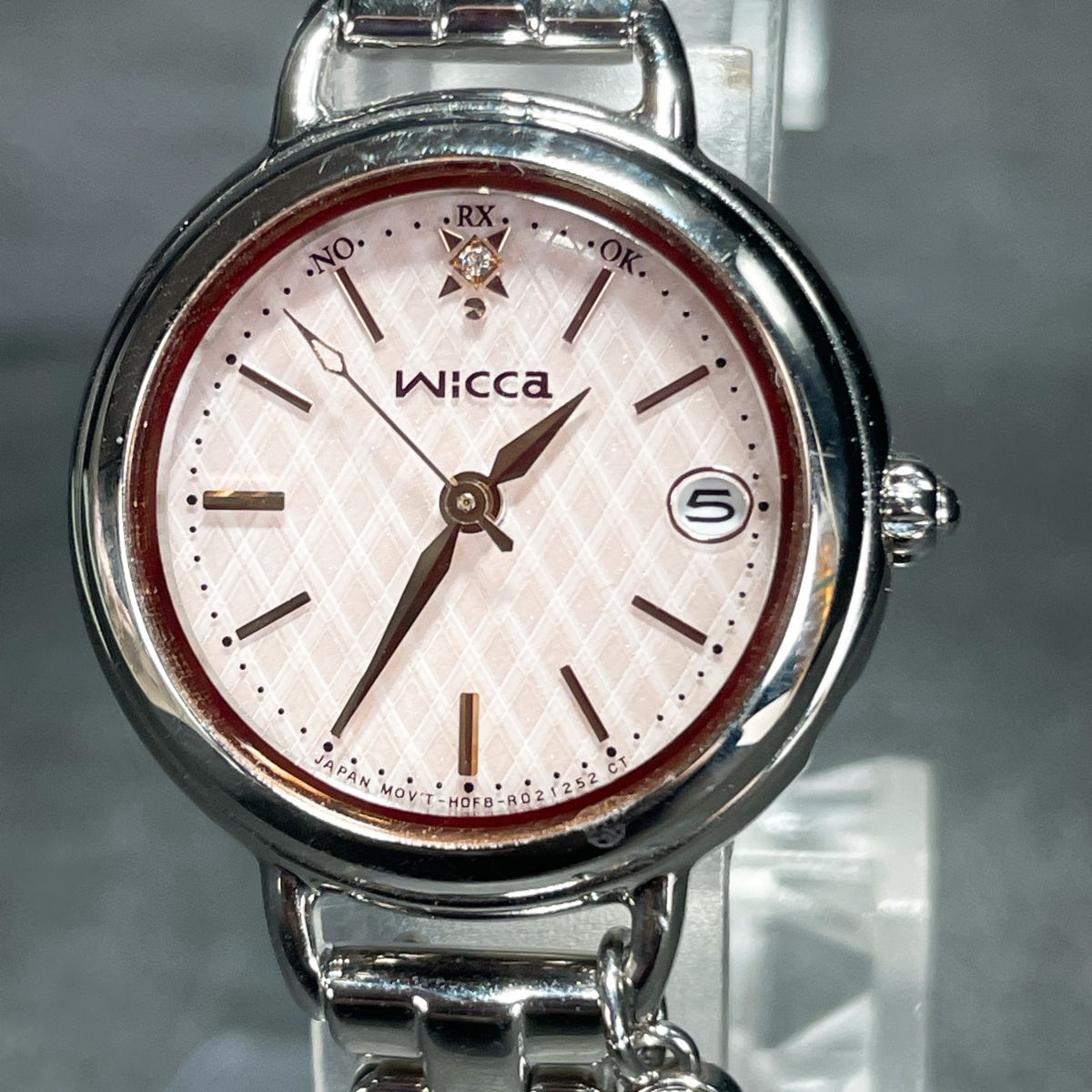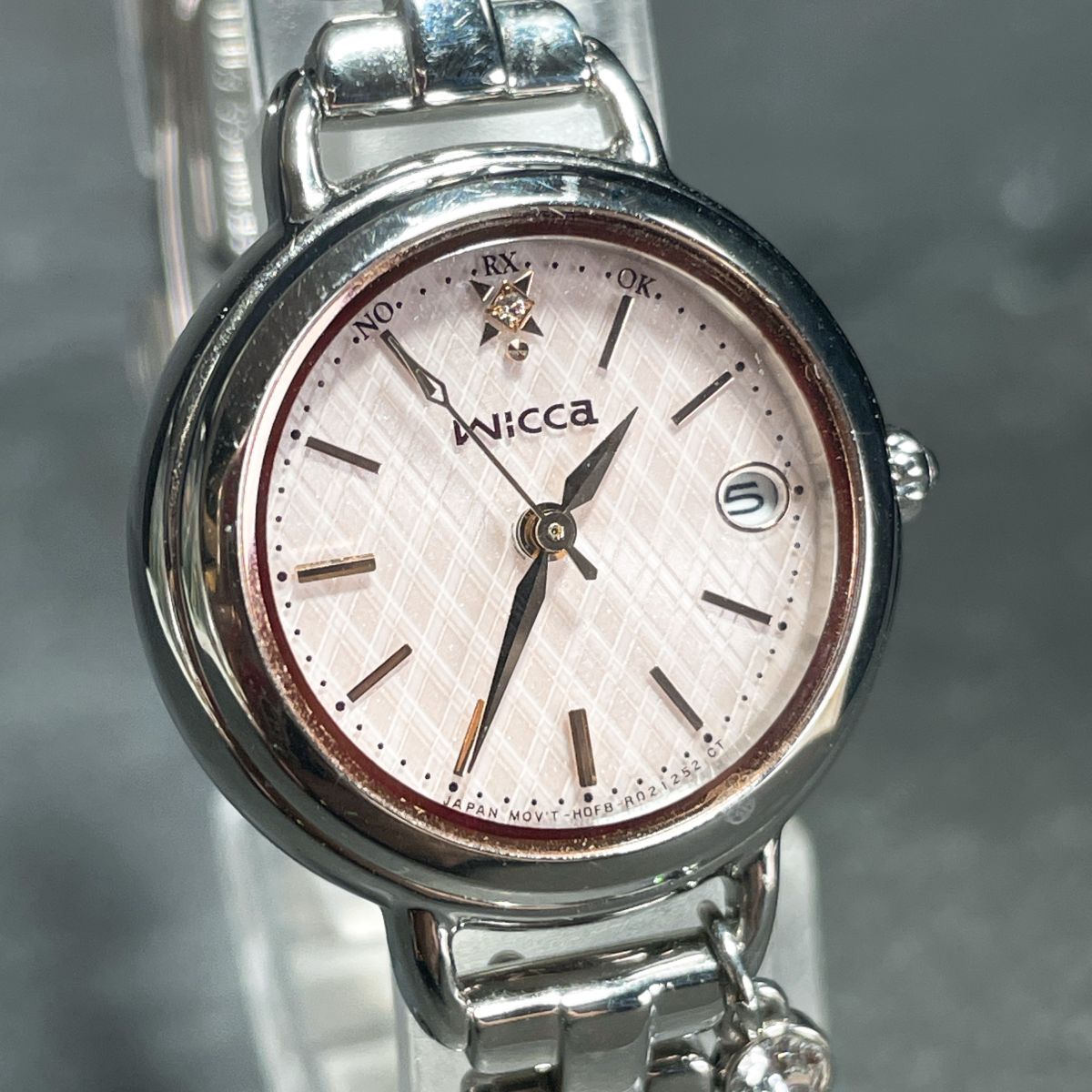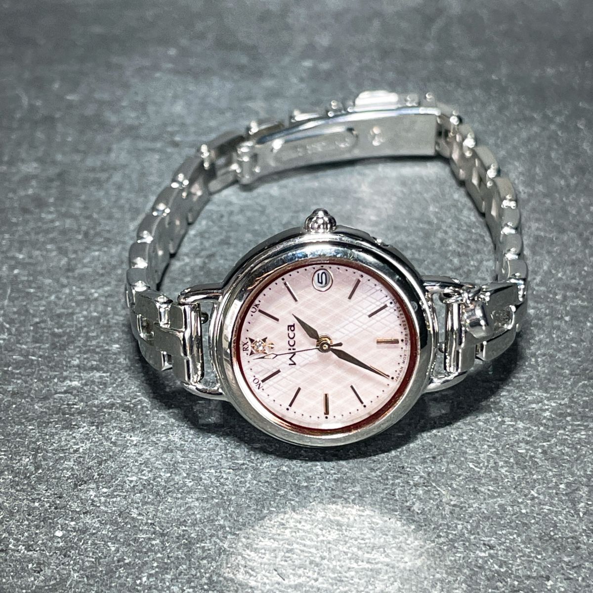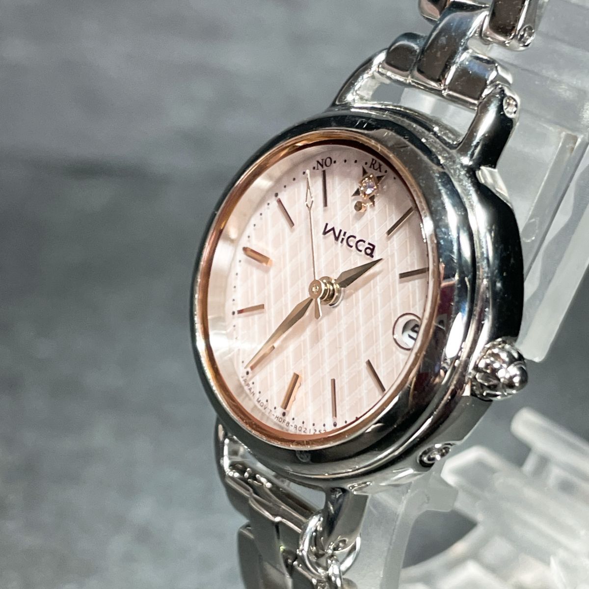 美品 CITIZEN シチズン Wicca ウィッカ H0F8-R007491 腕時計 アナログ 電波ソーラー 3針 カレンダー ピンク文字盤 メタルバンド シルバー