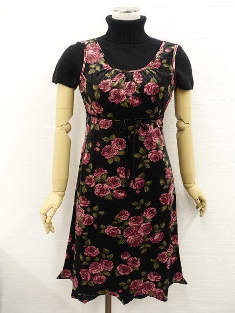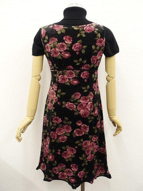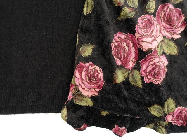 ひざ丈ベロアノースリーブワンピース+半袖ニットセーター コーディネート2点セット M相当 ブラック地 ピンク×ワインレッド 花柄/ブラック フェミニン