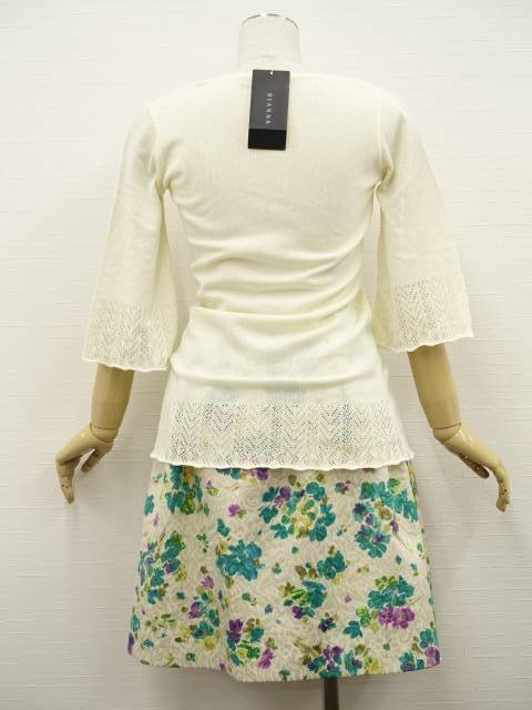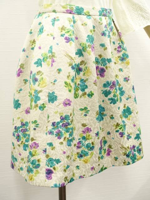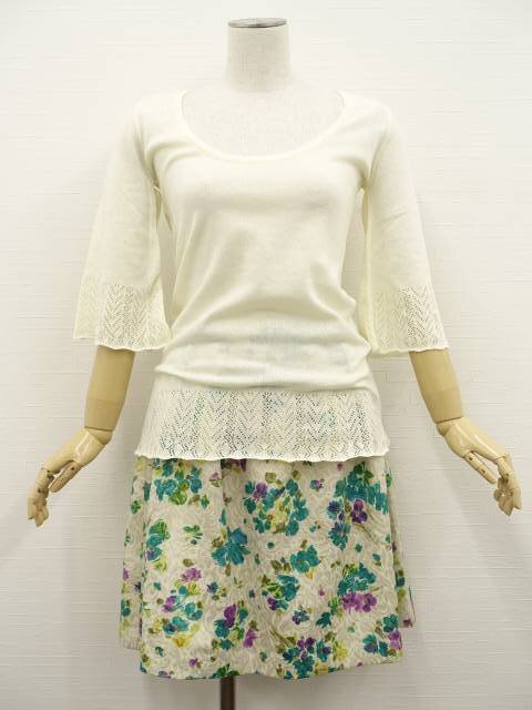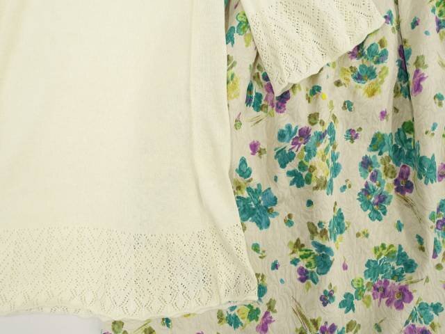 七分袖ニットカットソー+ひざ丈タックスカート コーディネート上下2点セット M相当 クリーム/ライトベージュ地パープル×グリーン 花柄 フェミニン系 20代