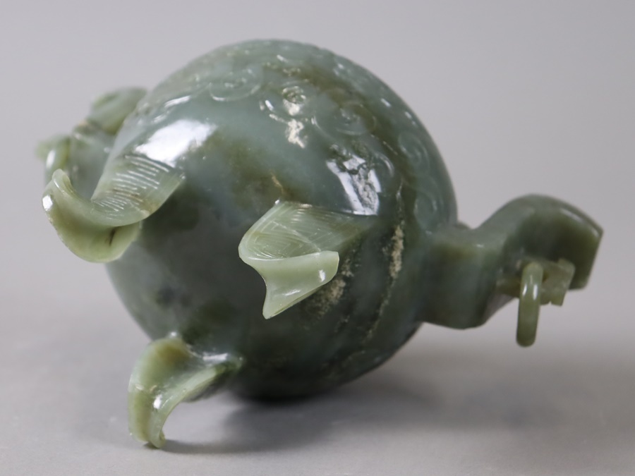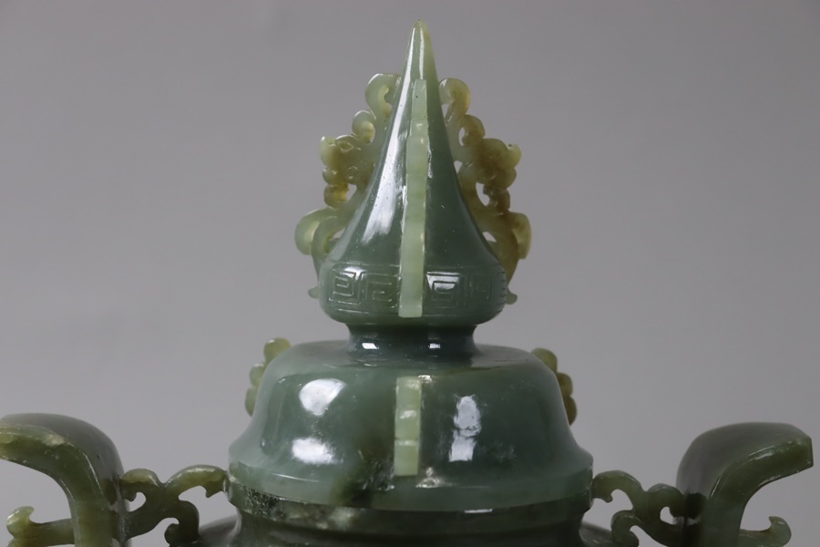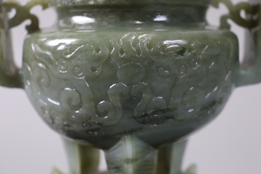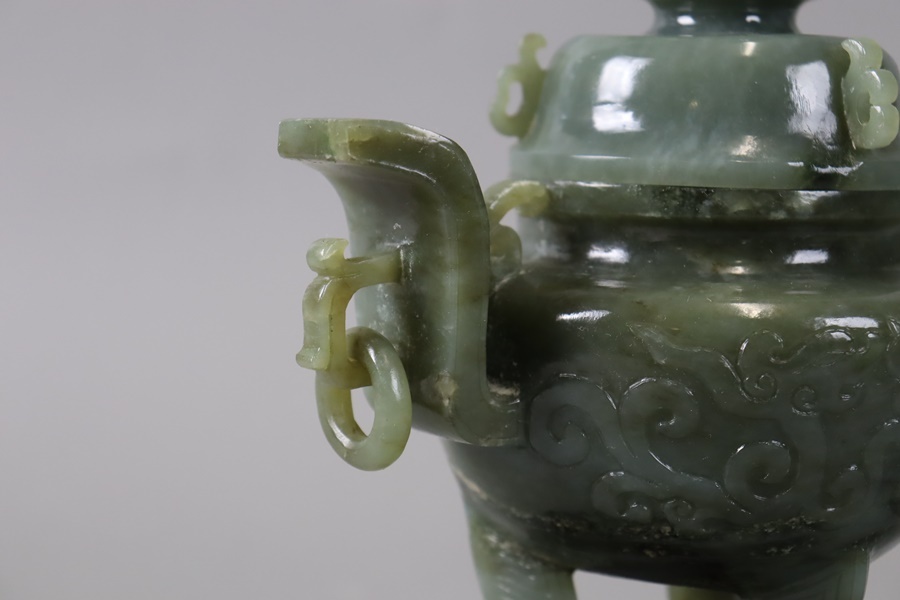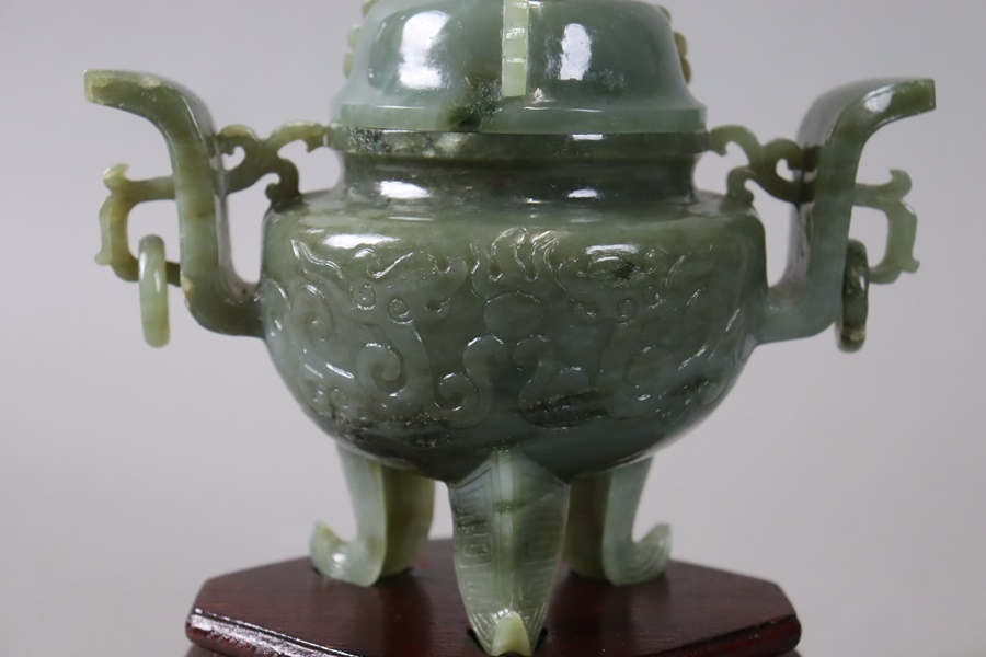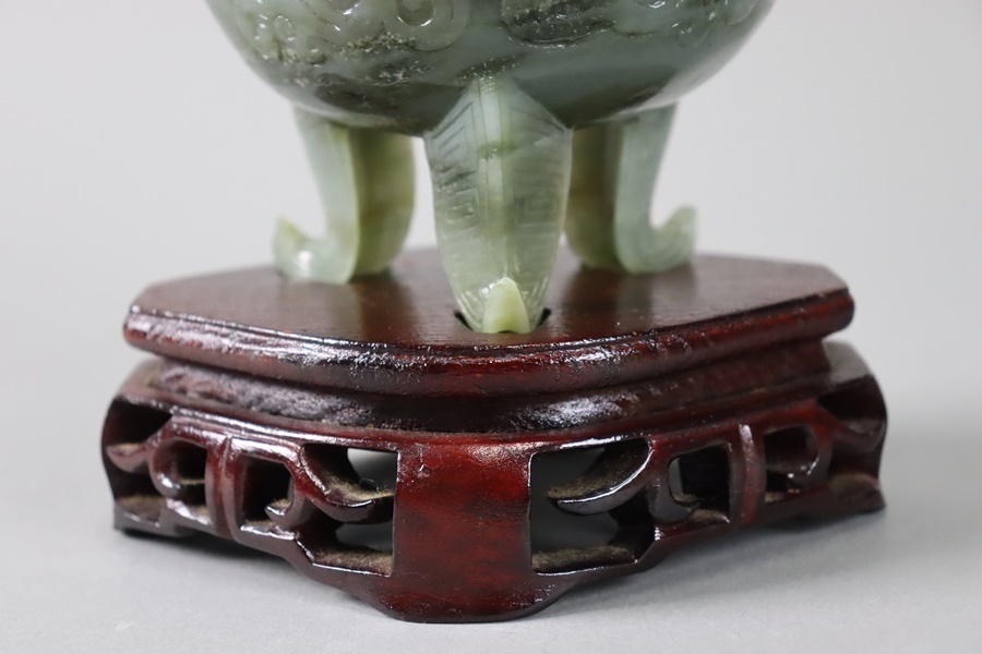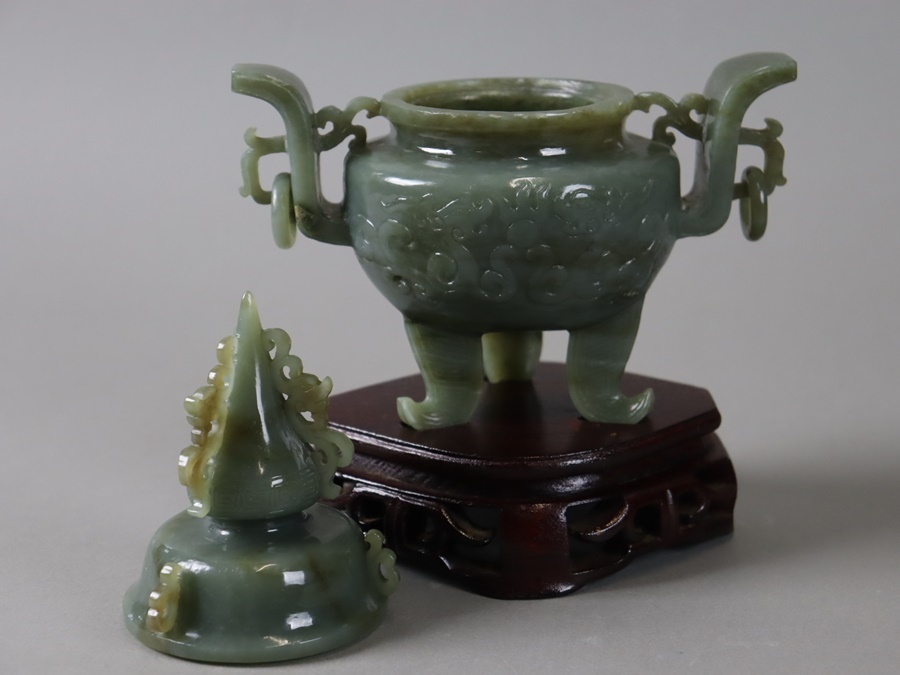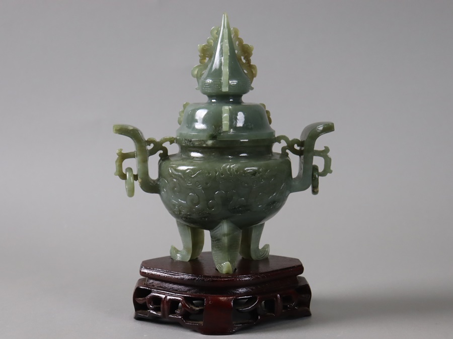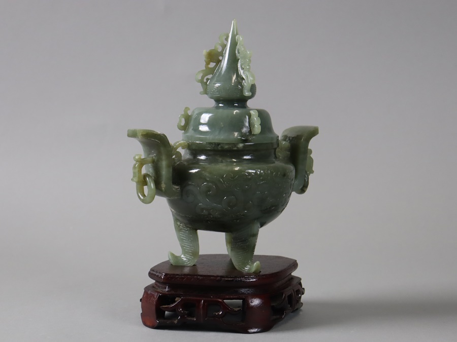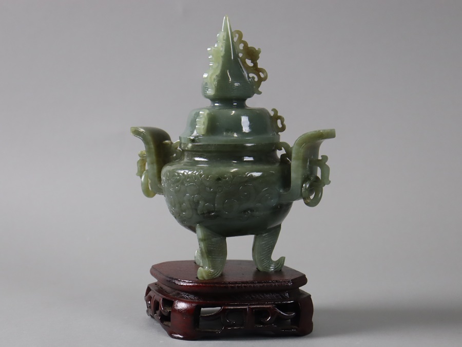 中国古玩 唐物 和田玉 香炉 唐木台付 香道具 翡翠/碧玉/天然石/彫刻/細密細工 古美術品[d1228]