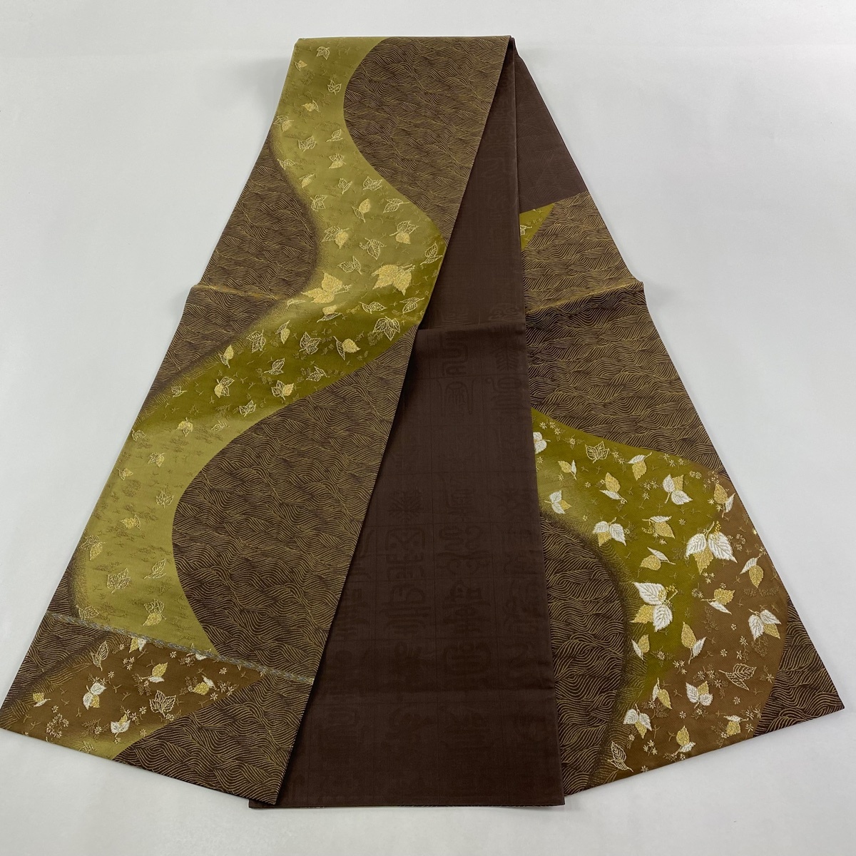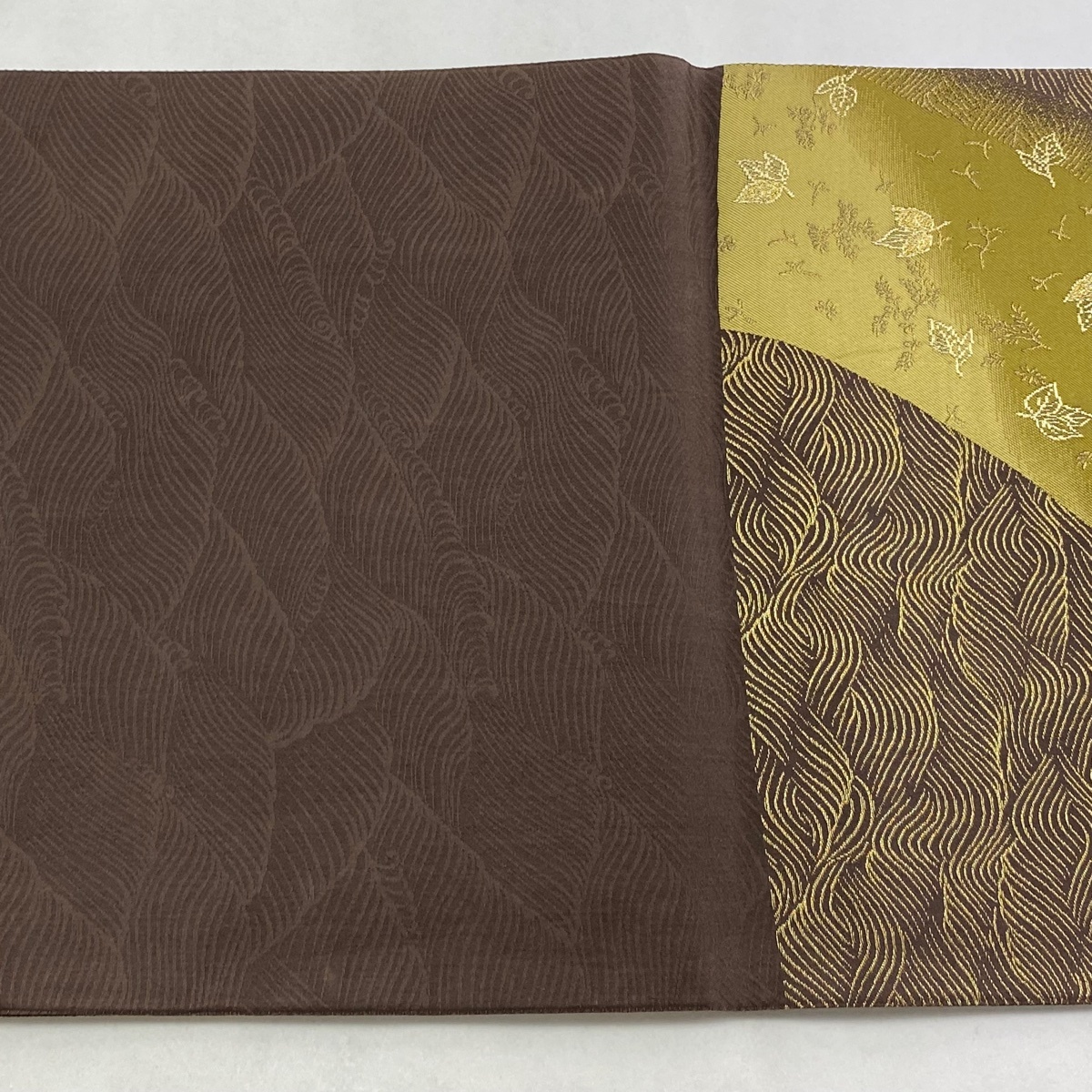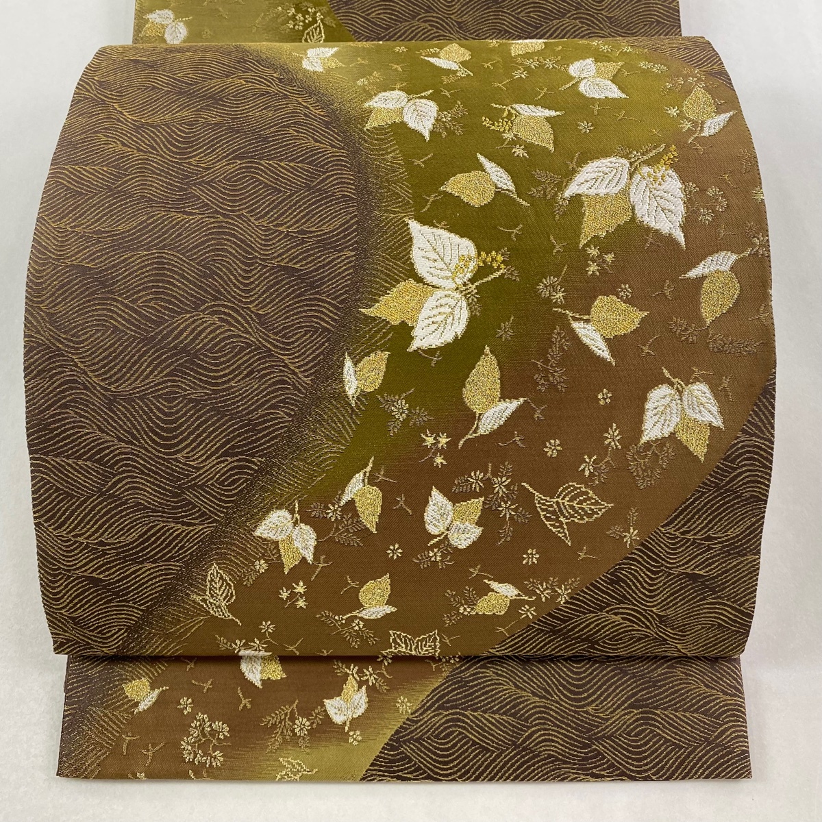 | 袋帯 美品 逸品 誉田屋源兵衛 落款 葉柄 波 金糸 箔 茶緑色 お太鼓柄 正絹 【中古】 |