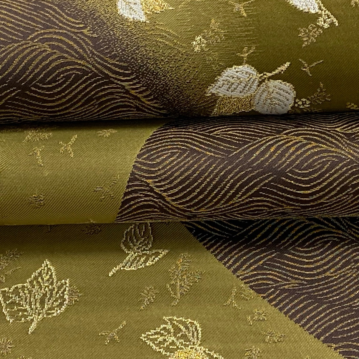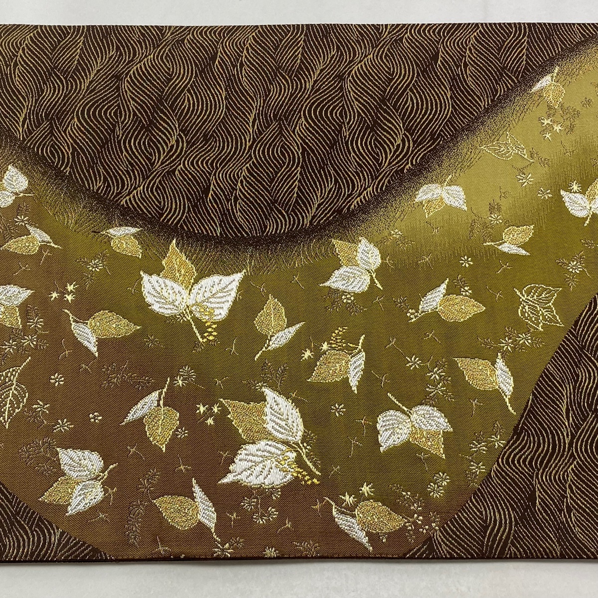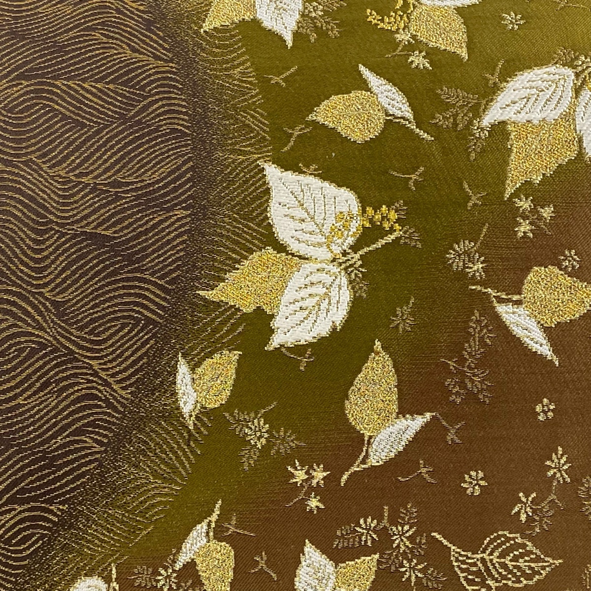 | 袋帯 美品 逸品 誉田屋源兵衛 落款 葉柄 波 金糸 箔 茶緑色 お太鼓柄 正絹 【中古】 |