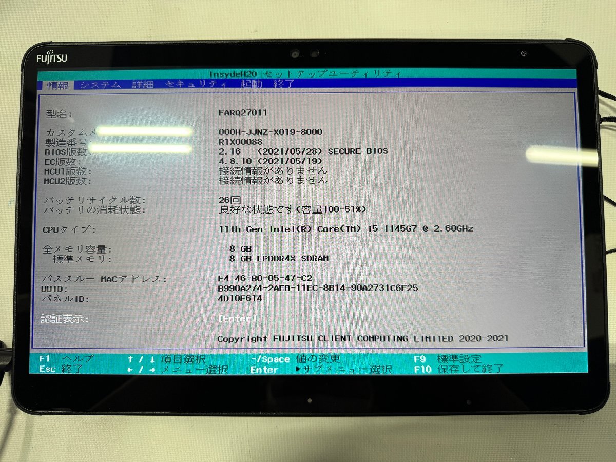 BIOS画面上では「良好な状態」と表示されていました。 ※なお中古品のため消耗度合や持続時間については保証対象外とさせていただきます。 |