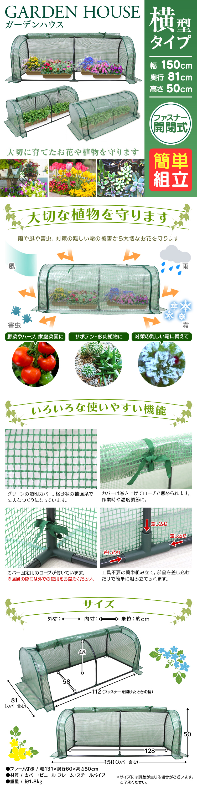 雨や風、対策の難しい霜の被害などからお花や植物を守ります。 ビニールカバーを下ろせば害虫対策にも! コンパクトなのでお庭や玄関、ベランダに置いても邪魔にならず、 お天気が気になる時には室内にも置けるサイズ感です♪ カバーは巻き上げてロープで留められます。 お手入れ作業中や、ハウス内の温度上昇が気になる時はカバーを巻き上げ、 風をいれて温度調節が可能です。 組み立ては工具不要! 部品を差し込むだけで簡単に完成します。 ぜひ、お気に入りのお花たちをいっぱいならべて あなた独自の素敵な空間を作り上げてみませんか♪ 【商品詳細】 カラー ・グリーン(カバー) ・ブラック(棚) サイズ:(約)幅150m×奥行き81cm×高さ50cm 重量:(約)1.8kg タイプ:横型 素材:スチール、PVC 他 商品コード:AAH004GR |