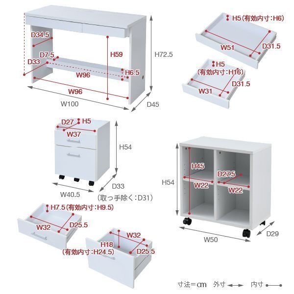 【カラー】 ダークブラウン、ナチュラル、ホワイト 【サイズ】 <外寸> デスク:幅100×奥行45×高さ72.5cm チェスト:幅40.5×奥行33×高さ54cm ラック:幅50×奥行29×高さ54cm <内寸> デスク引き出し小:幅31×奥行31.5×高さ5(有効6)cm デスク引き出し大:幅51×奥行31.5×高さ5(有効6)cm 配線コードボックス:幅96×奥行7.5×深さ6.5cm チェスト天板:幅37×奥行27×高さ5cm チェスト引き出し小:幅32×奥行25.5×高さ7.5(有効9.5)cm チェスト引き出し大:幅32×奥行25.5×高さ18(有効24.5)cm ラックオープン部左右共通:幅22×奥行27.5×高さ45cm 可動棚:幅22×奥行27×厚み1.5cm(3.2cmピッチ7穴) 【材質】 デスク天板:合成樹脂化粧合板(PVC) デスク本体/チェスト/ラック:プリント紙化粧合板 【耐荷重】 デスク天板:30kg以下 デスク引き出し:(小)4kg以下 (大)5kg以下 チェスト天板:5kg以下 チェスト引き出し:(小)5kg以下 (大)7kg以下 ラック天板:10kg以下 ラック可動棚:5kg以下 【生産国】 インドネシア 【梱包】2梱包でお届けします。 2-1 サイズ:104×39×14cm、重量:20.6kg 2-2 サイズ:53.5×33×29cm、重量:19.2kg 【その他】 ・チェスト:キャスター5個(うちストッパー付き2個) ・ラック:キャスター4個(うちストッパー付き2個) 【組み立て品】 お客様による組み立てが必要です。 【ご注意】 ・サイズ、重量は概算です。 ・商品カラーはご使用のモニターによって実際の明るさや色と異なって見える場合がございます。 |