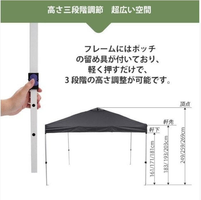 • 【高さ三段階調節 超広い空間】フレームには使いやすくワンタッチのポッチの留め具が付いており、軽く押すだけで、3 段階の高さ調整が可能です。