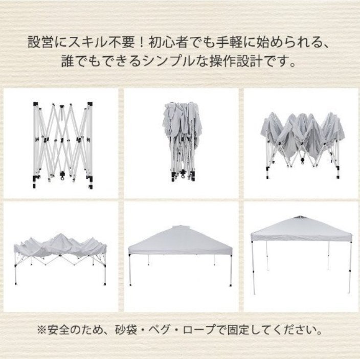 • 【組み立てが超簡単!あっという間に設置完了!大人 2 人でカンタンにセットアップ】設営にスキル不要!初心者でも手軽に始められる、誰でもできるシンプルな操作設計です。※安全のため、砂袋・ペグ・ロープで固定してください。5分程度でテントセットアップが完了し、キャンプの準備時間を大幅に短縮できます♪
