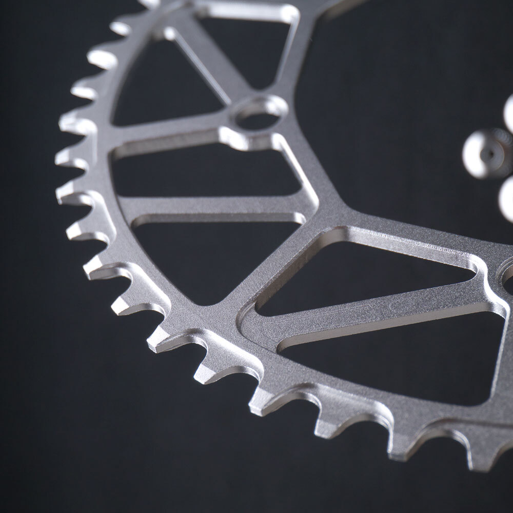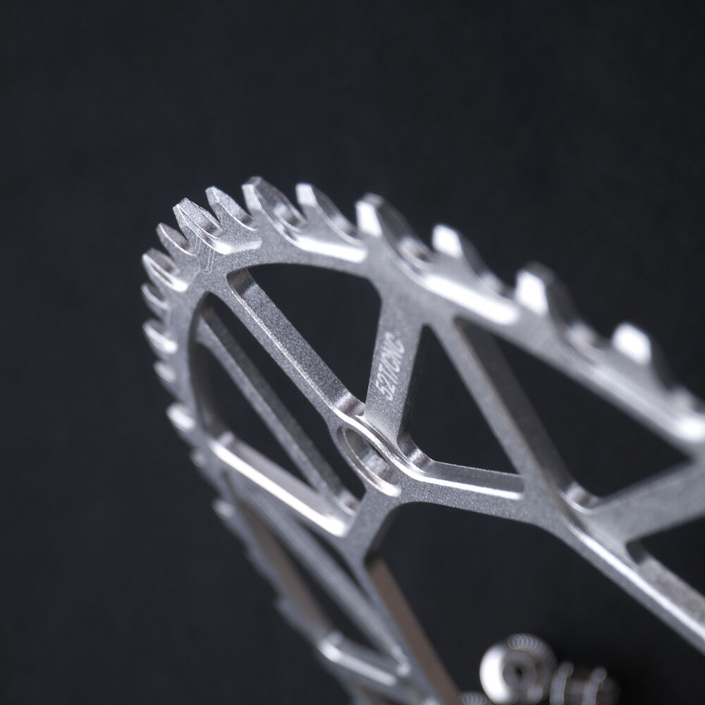 以前からLiteproはこの製品を10速対応としていますが、購入したユーザーから11速で使えるという報告があることから、一部の販売店ではこの製品を11速対応と銘打って販売しています。どうやら公式にアナウンスされることなく歯厚が変更されたようで、手元にある数年前のLiteproナローワイドチェーンリングと比較すると、旧版のワイド歯厚4mmに対して、現行版はワイド歯厚3.7mm前後となっています。実際にシマノ11速チェーン(CN-HG600)で確認してみたところ、かかり具合にとくに問題はありませんでした。これらのことから11速でも使用可能と思われますが、あくまでメーカーの公式アナウンスではないということをご理解のうえでご検討ください。