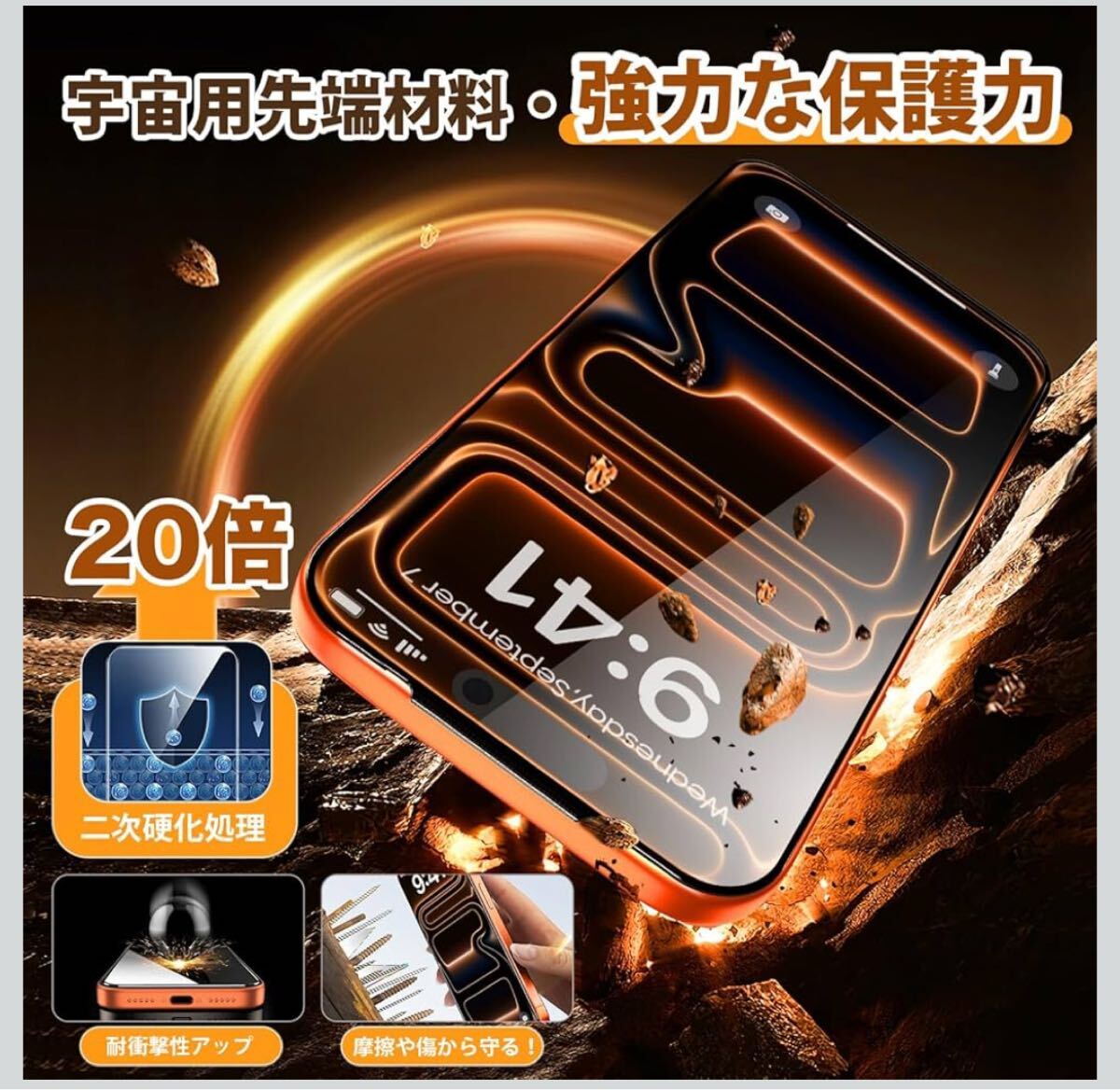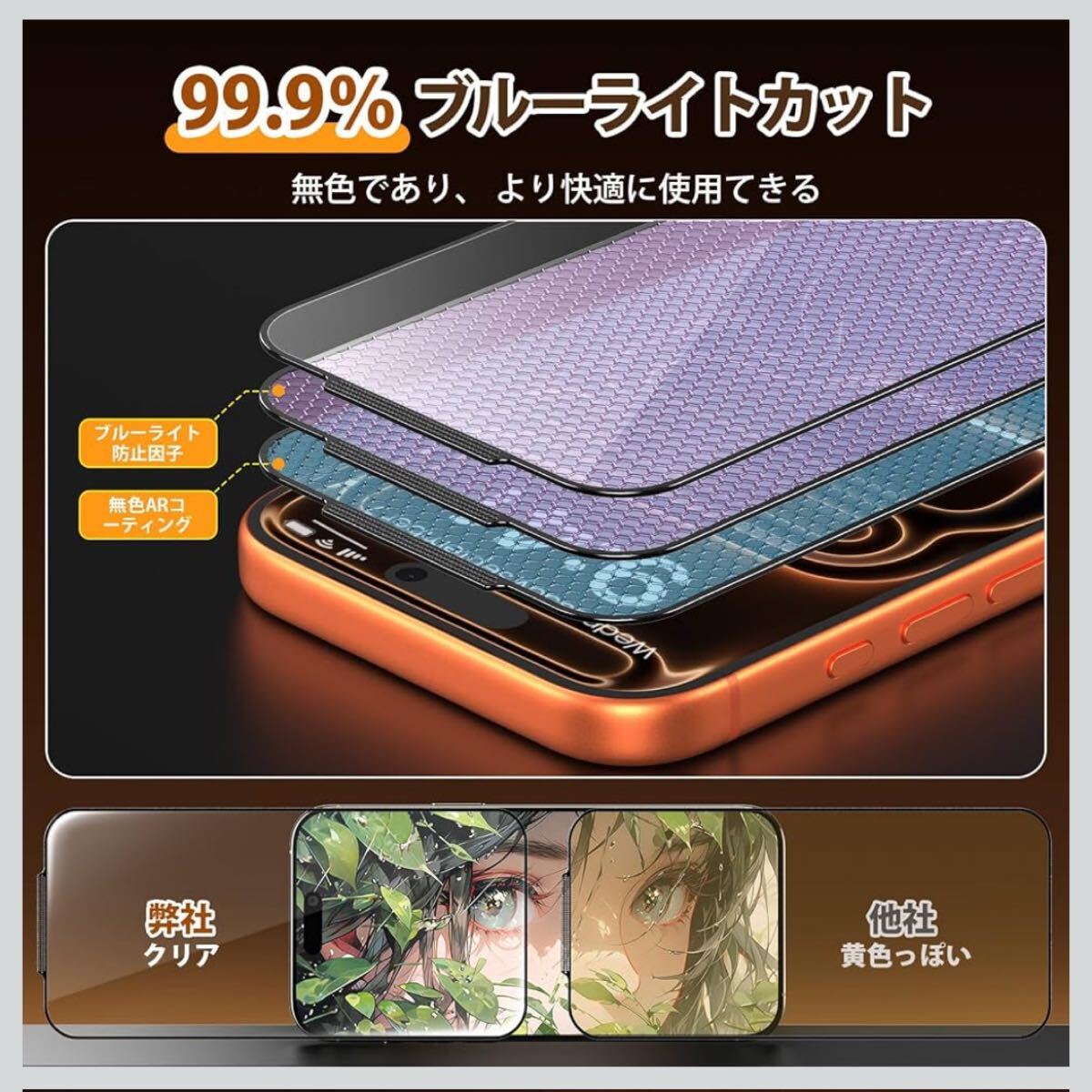 【画期的な技術・99.9%ブルーライトカット】ガラスフィルム基材にブルーライト防止因子を加え、有害なブルーライトを吸収することでブルーライトを遮断し、持続的なブルーライトによる目へのダメージを軽減します。また、Phone 17Pro フィルムにドイツで開発されたARコーティングを施し、有害なブルーライトを反射させます。「吸収」+「反射」の2つのカット方式で99.9%ブルーライトカットを実現しました。
