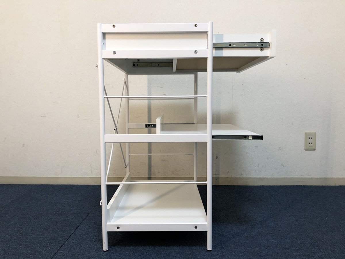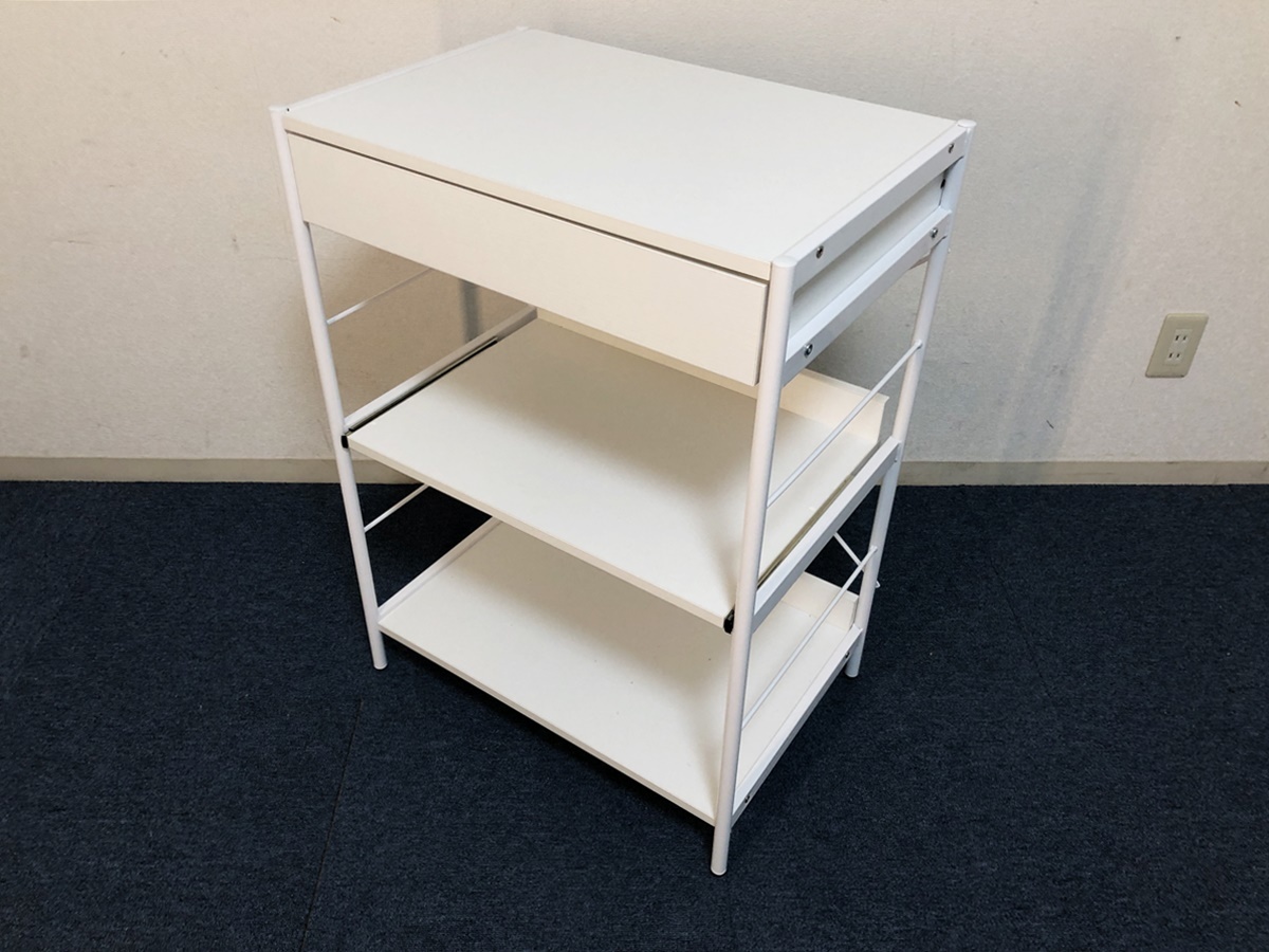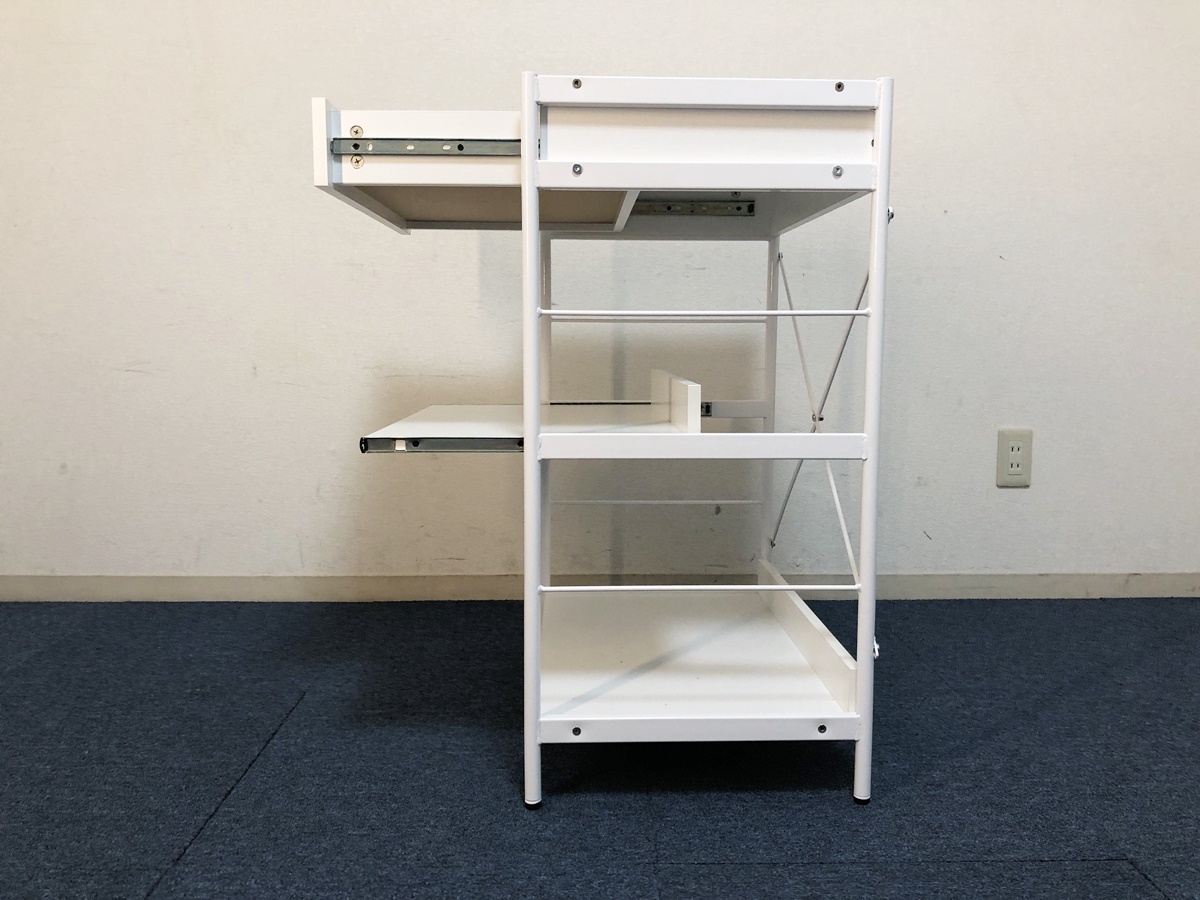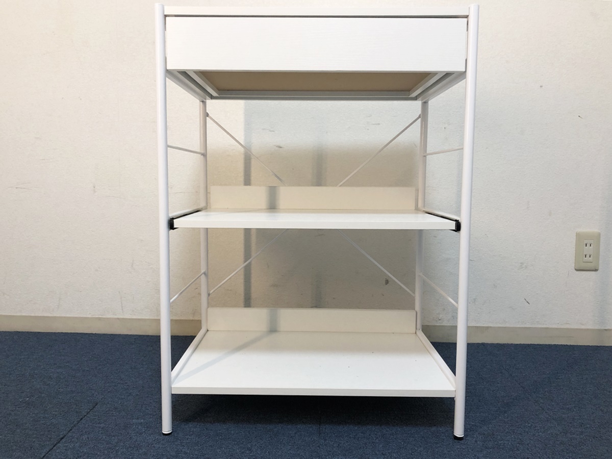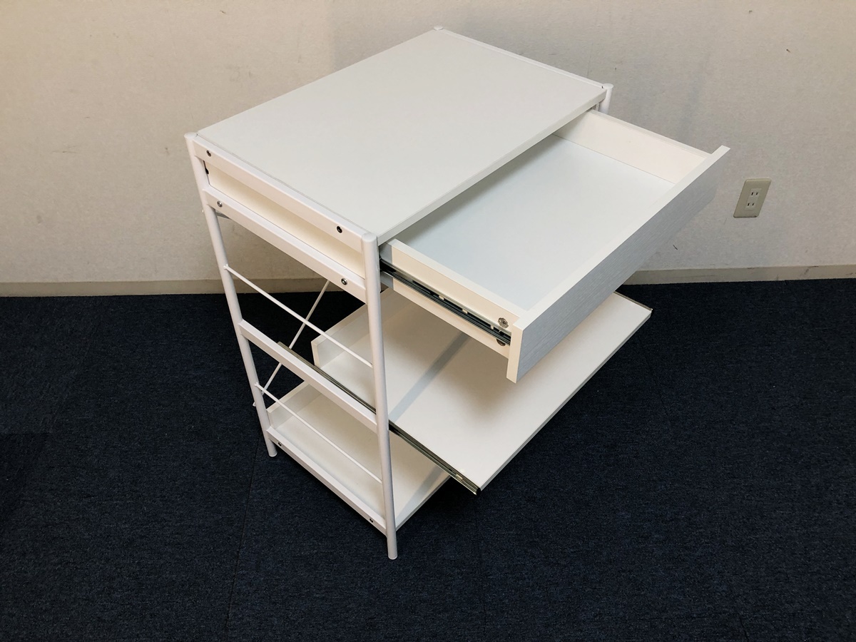 レンジボード引出し・スライドテーブル付き 収納棚 脚部アジャスター付キャビネット 【商品詳細】 ■本体サイズ:幅600×奥行410×高さ835mm ■天板サイズ:幅560×奥行400mm ■引出しサイズ:幅480×奥行335×高さ65mm ■スライドテーブルサイズ:幅540×奥行370×高さ280mm ■下段棚板サイズ:幅560×奥行375×高さ315mm ■固定棚耐荷重:約15㎏ スライドテーブル:約8㎏ 引出し:約5㎏ ※採寸は目安程度でお考え頂き多少の誤差は了承願います。 ■未使用ですが検品確認の為、開封・組立ました。ご理解頂ける方のみ検討願います。 ■棚板の耐荷重は最大約15㎏、複数のキッチン家電も設置可能です。 ■脚部にはがたつきを緩和するアジャスター付。 ■充実収納&マルチに使えるローラック、大きな家電からお部屋の小物まで。 ■引出しとスライドレール付きの3段ラック、効率的に収納出来ます。 ■材質:フレーム/スチール 板/メラミン化粧繊維板 アジャスター/プラスチック ■カラー:ホワイト ■組立品(購入者様にて組立)工具は付属しません。 ■解り難いですが棚板表面を4ヶ所穴埋めしています、気になさる方はご遠慮ください。 (組立の際レールを逆に取付た為。) ■他気になる事など御座いましたらお気軽に質問下さい。 (注意) 環境、モニター画面等により色合いが異なります。 【商品管理番号】324 |