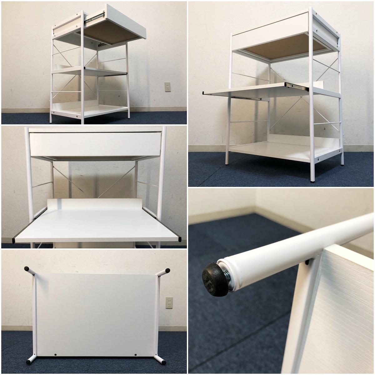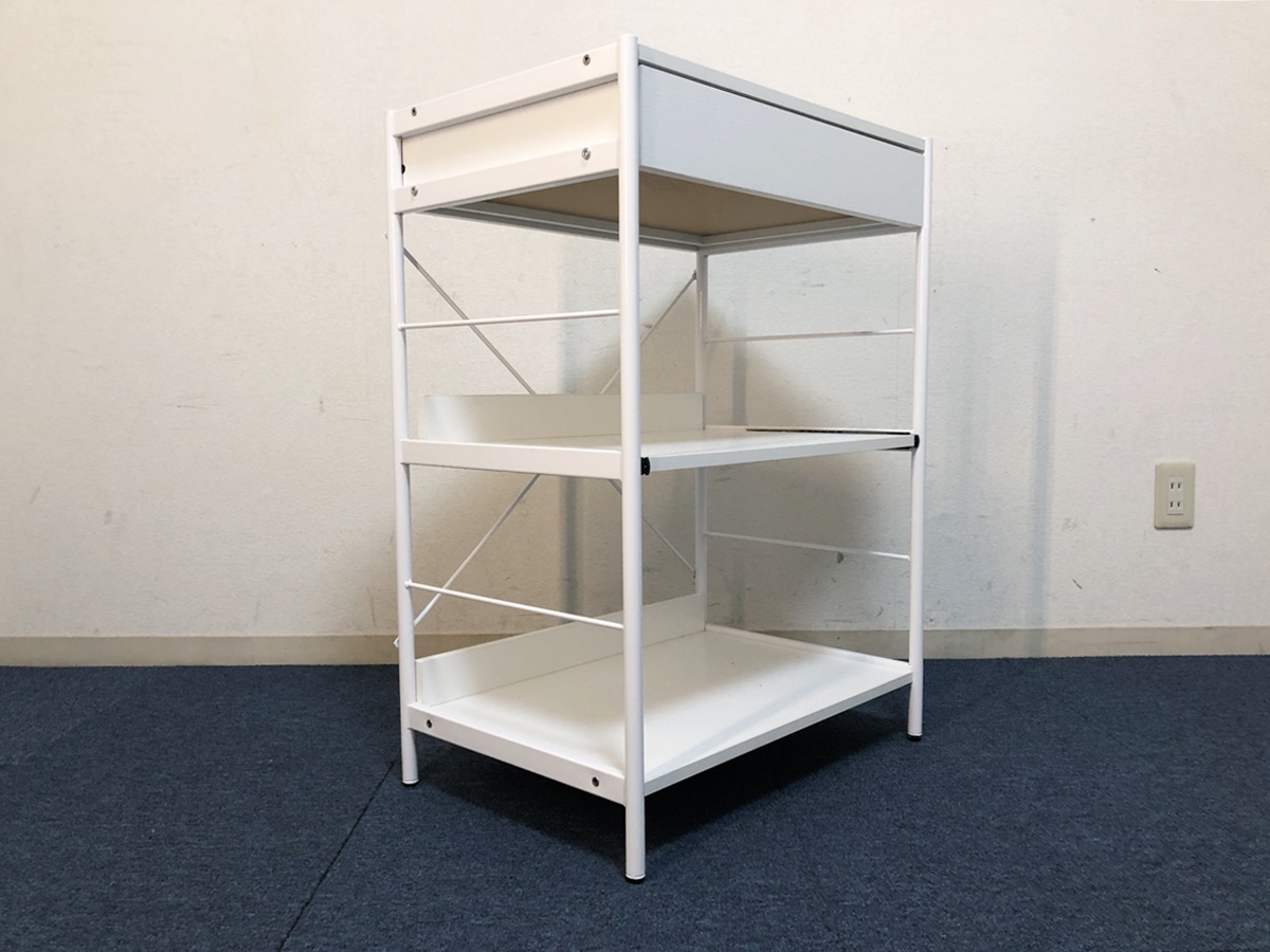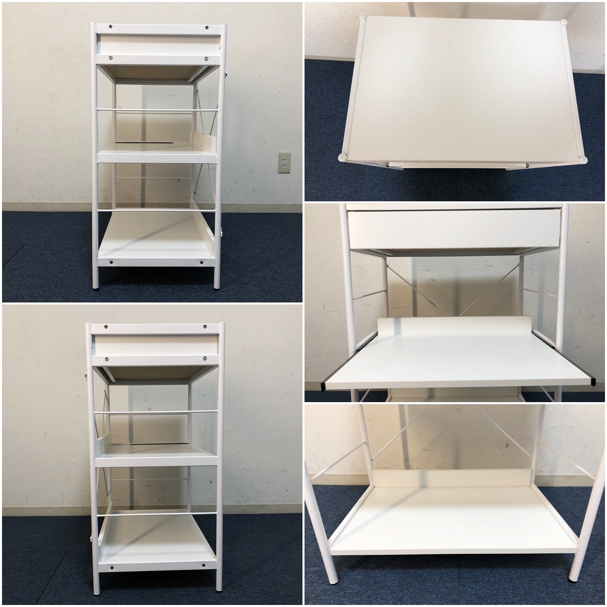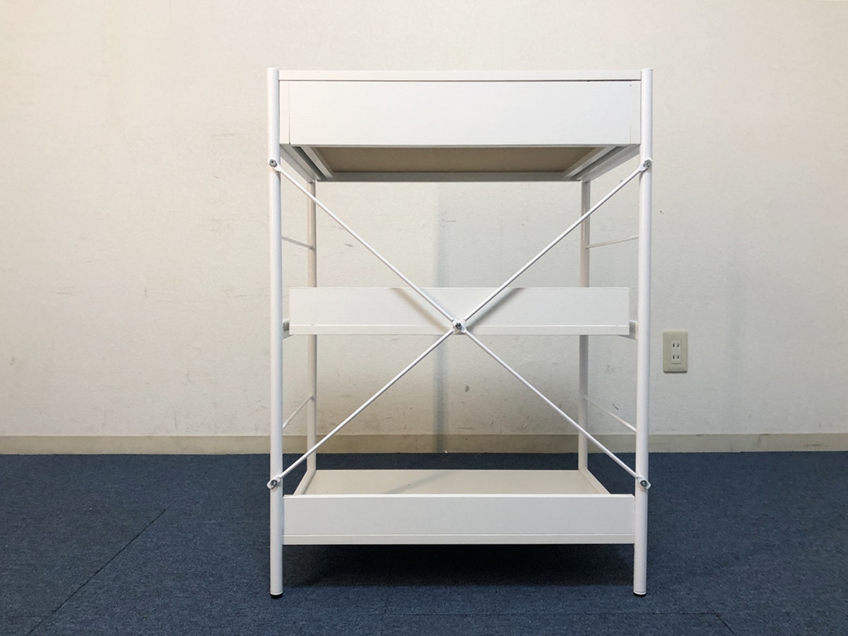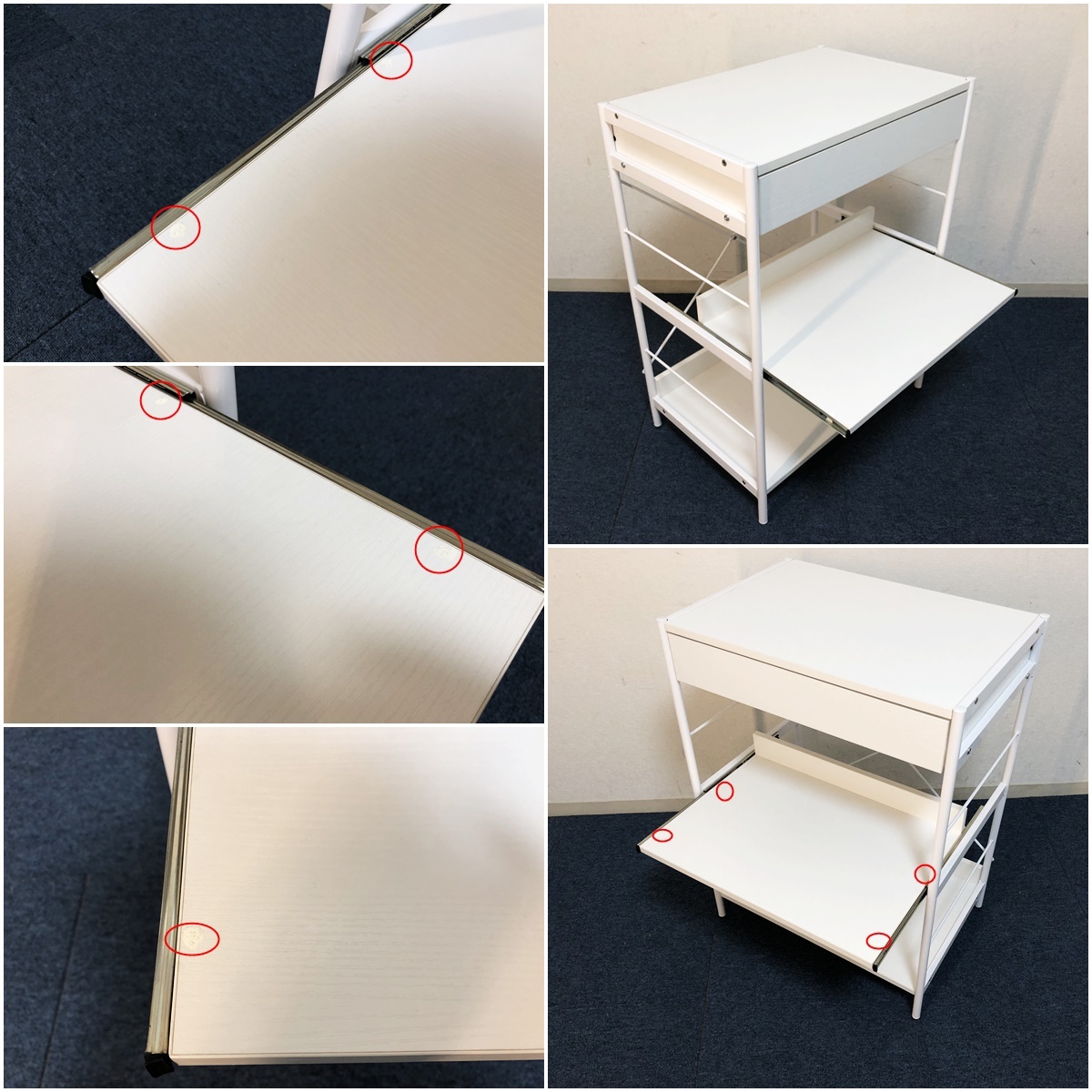 レンジボード引出し・スライドテーブル付き 収納棚 脚部アジャスター付キャビネット 【商品詳細】 ■本体サイズ:幅600×奥行410×高さ835mm ■天板サイズ:幅560×奥行400mm ■引出しサイズ:幅480×奥行335×高さ65mm ■スライドテーブルサイズ:幅540×奥行370×高さ280mm ■下段棚板サイズ:幅560×奥行375×高さ315mm ■固定棚耐荷重:約15㎏ スライドテーブル:約8㎏ 引出し:約5㎏ ※採寸は目安程度でお考え頂き多少の誤差は了承願います。 ■未使用ですが検品確認の為、開封・組立ました。ご理解頂ける方のみ検討願います。 ■棚板の耐荷重は最大約15㎏、複数のキッチン家電も設置可能です。 ■脚部にはがたつきを緩和するアジャスター付。 ■充実収納&マルチに使えるローラック、大きな家電からお部屋の小物まで。 ■引出しとスライドレール付きの3段ラック、効率的に収納出来ます。 ■材質:フレーム/スチール 板/メラミン化粧繊維板 アジャスター/プラスチック ■カラー:ホワイト ■組立品(購入者様にて組立)工具は付属しません。 ■解り難いですが棚板表面を4ヶ所穴埋めしています、気になさる方はご遠慮ください。 (組立の際レールを逆に取付た為。) ■他気になる事など御座いましたらお気軽に質問下さい。 (注意) 環境、モニター画面等により色合いが異なります。 【商品管理番号】324 |