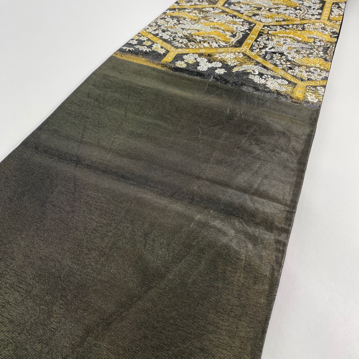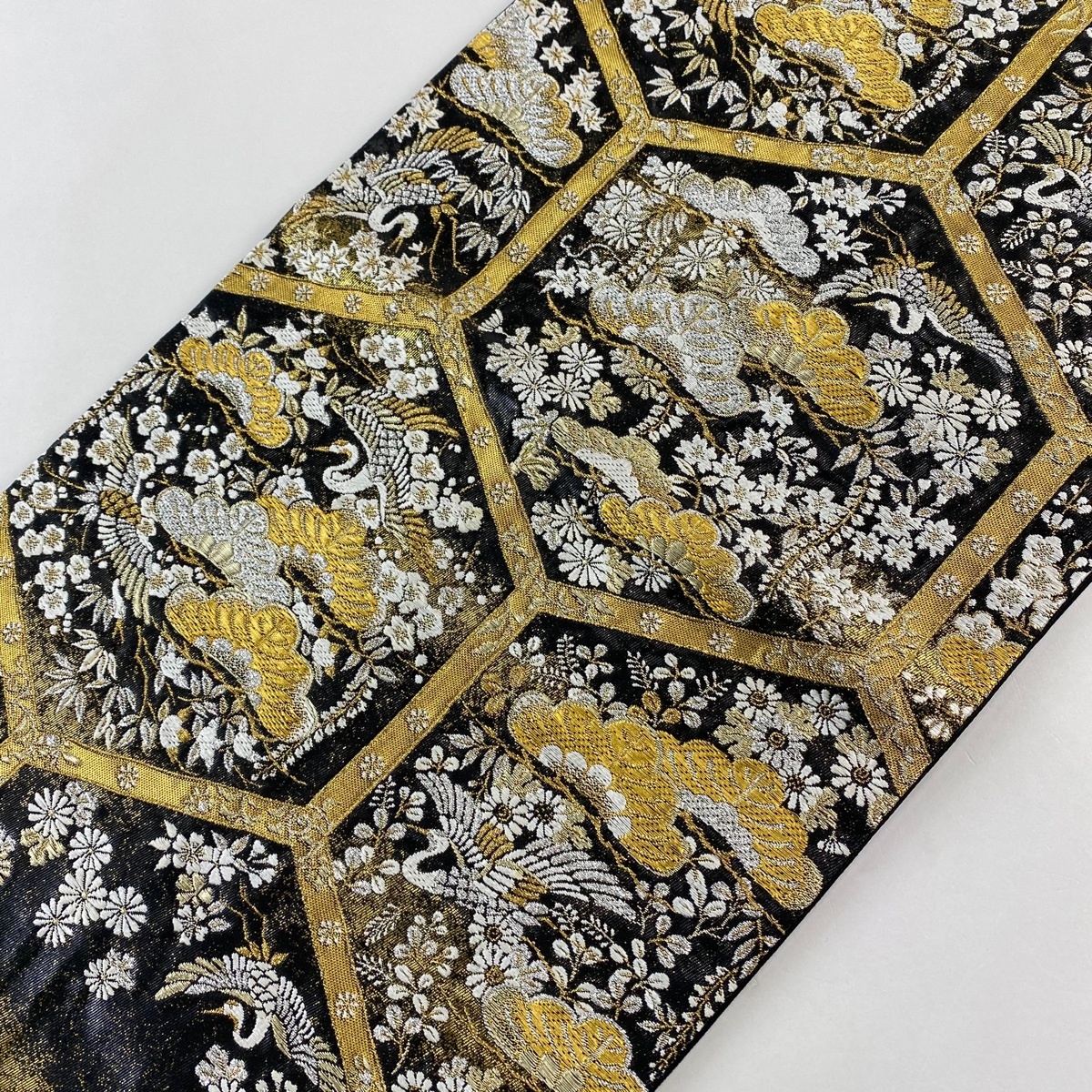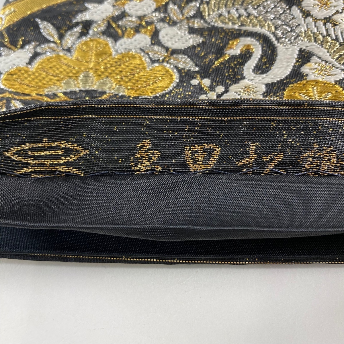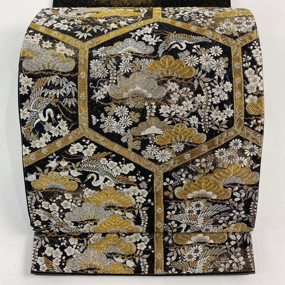 | 袋帯 美品 名品 河村織物 落款 亀甲松鶴文 金銀糸 箔 黒 六通 正絹 【中古】 |
