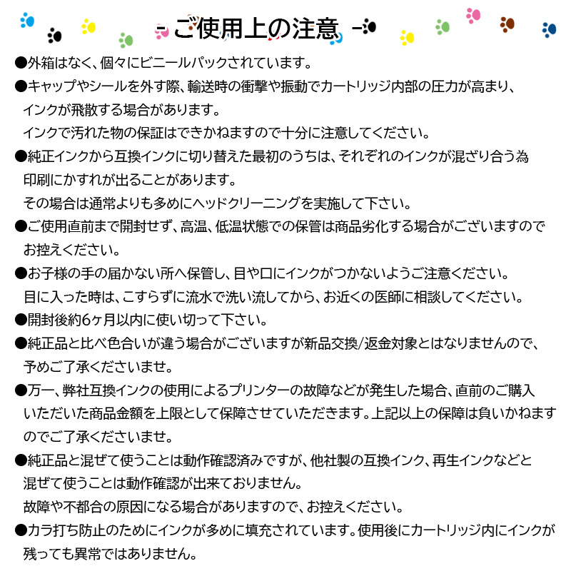 ・万一、弊社互換インクの使用によるプリンター本体のトラブル故障などは、ご購入金額を上限として保証致します。(他の機器の故障した場合や、その他の損失・損害につきましても同様です)