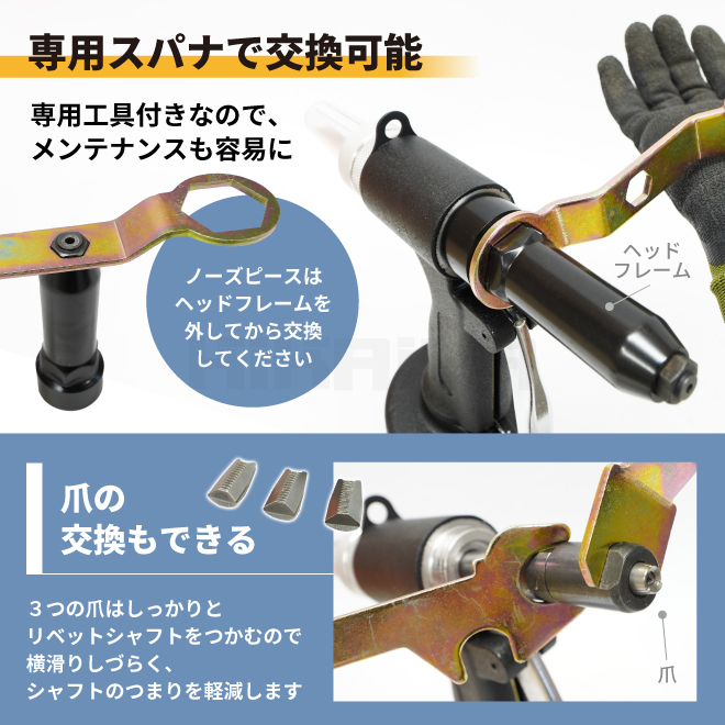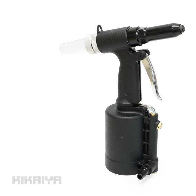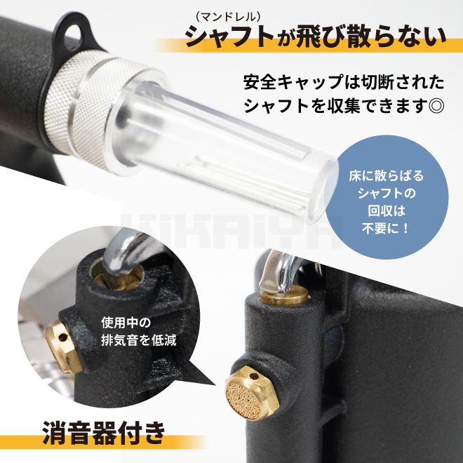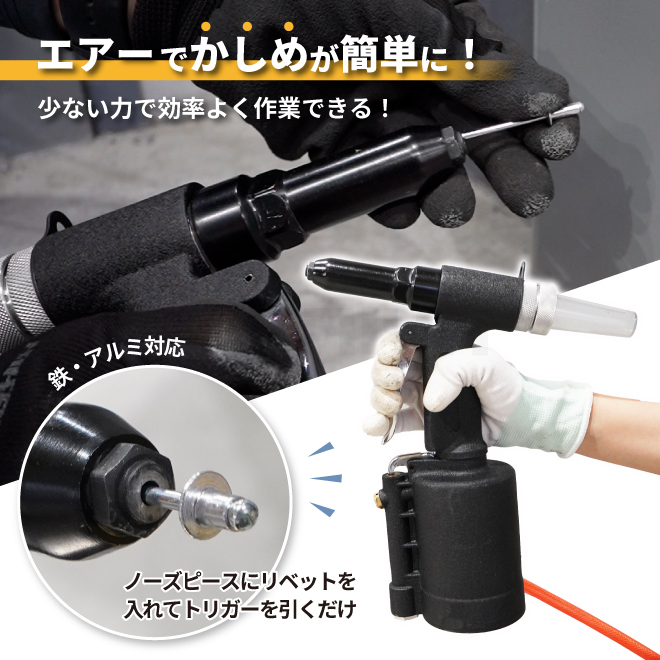 ・エアーで簡単にリベットをかしめできるリベッター ・手作業では時間がかかる大量のリベットを効率的に打ち込むことができます ・3つのノーズピース付きで、2.4~4.8mmの鉄・アルミのリベットに適応します ・専用スパナが付属しており、ノーズピースの交換やメンテナンスも容易です ・消音器で使用中の排気音を低減します ・切断したリベットシャフトが飛び散ることがない安全キャップ付き ・工業用やDIYなど、さまざまな場面で活躍します |