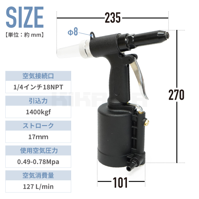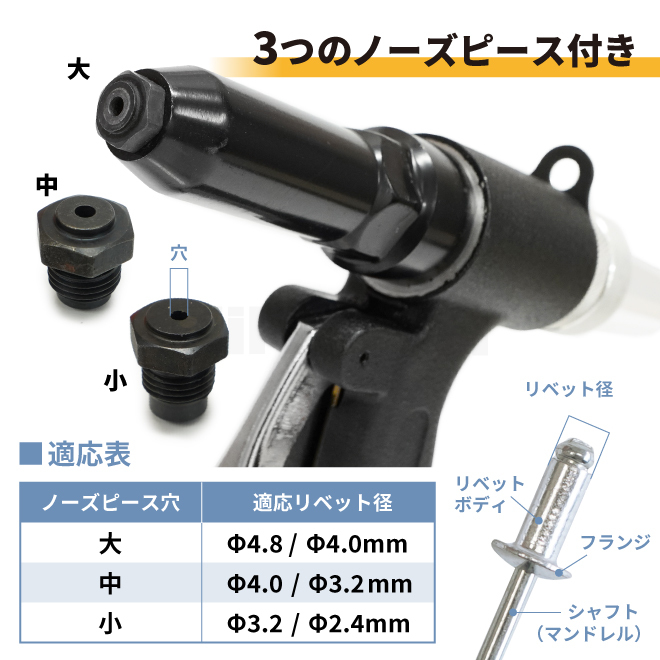 | 適応リベット径 | φ2.4、φ3.2、φ4.0、φ4.8mm |