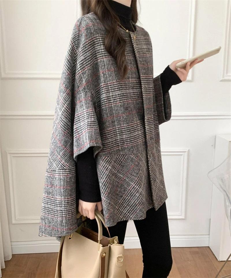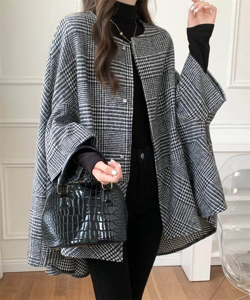新入荷~ ポンチョコート ウール調マント ドルマン ケープ ジャケット チェック柄~黒