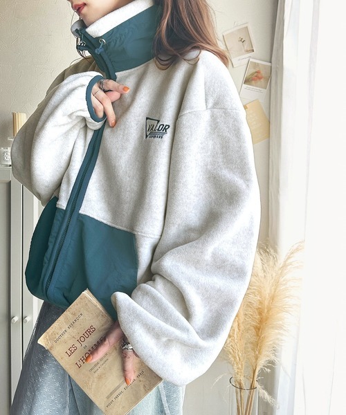 参考商品名:ヴィンテージライクで大人可愛いブルゾン。ワンポイントロゴ刺繍バイカラーフリースZIPブルゾン