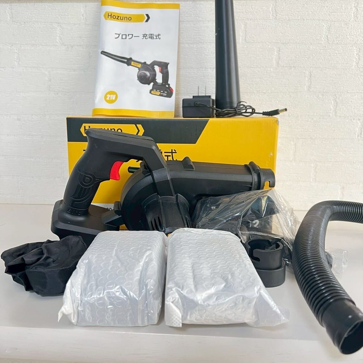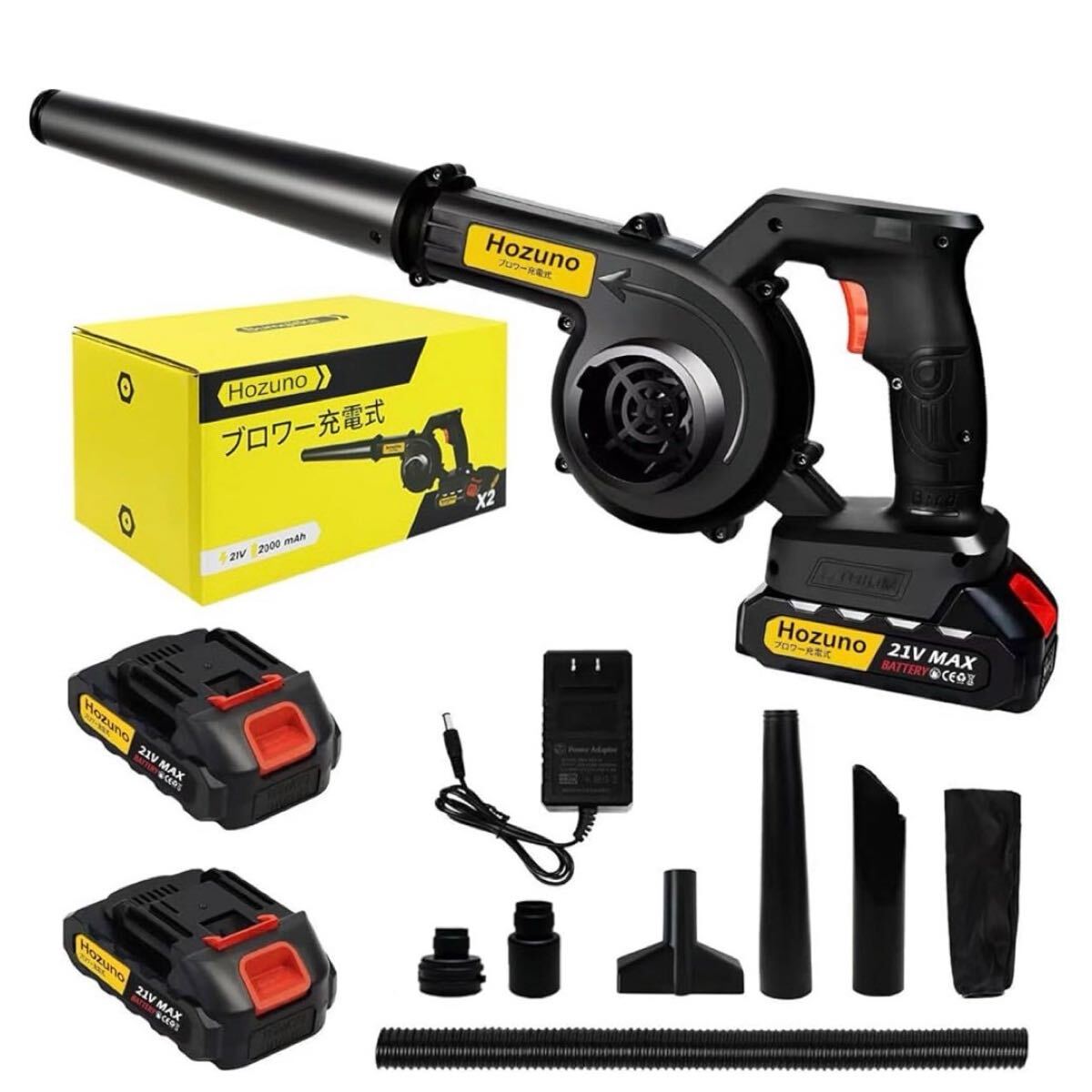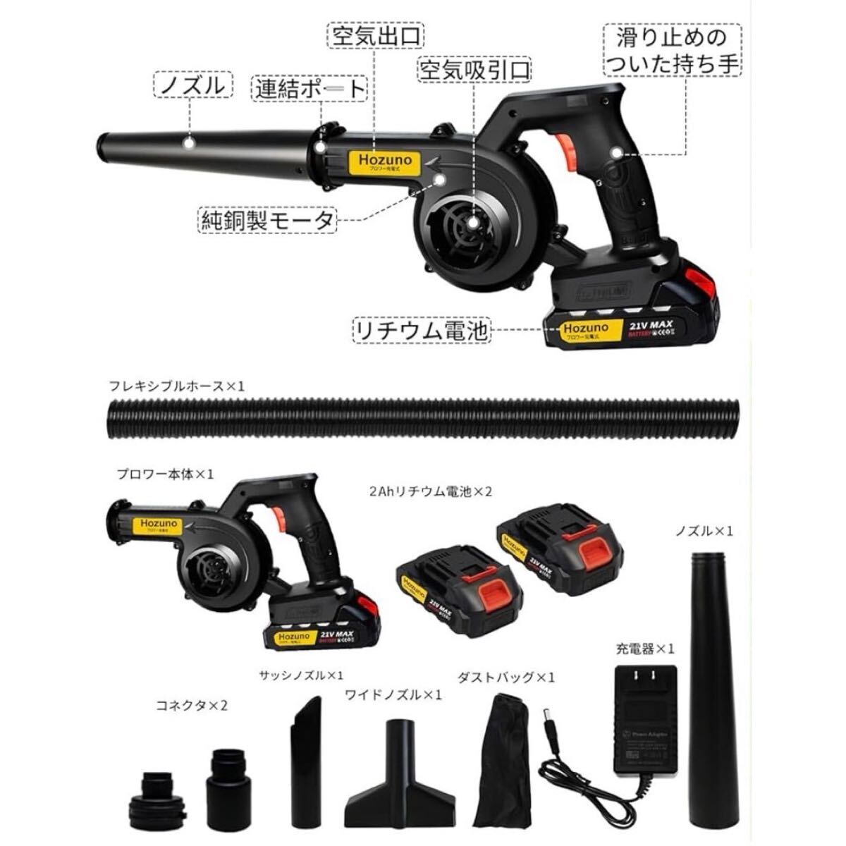 【アクセサリーが豊富でさまざまなシーンに対応】プロワー本体×1、リチウム電池×2、充電器×1、ワイドノズル×1、サッシノズル×1、フレキシブルホース×1、ノズル×1、コネクタ×3、ダストバッグ×1、日本語取説明。アクセサリーの種類が豊富で、清掃作業がより簡単になります。
